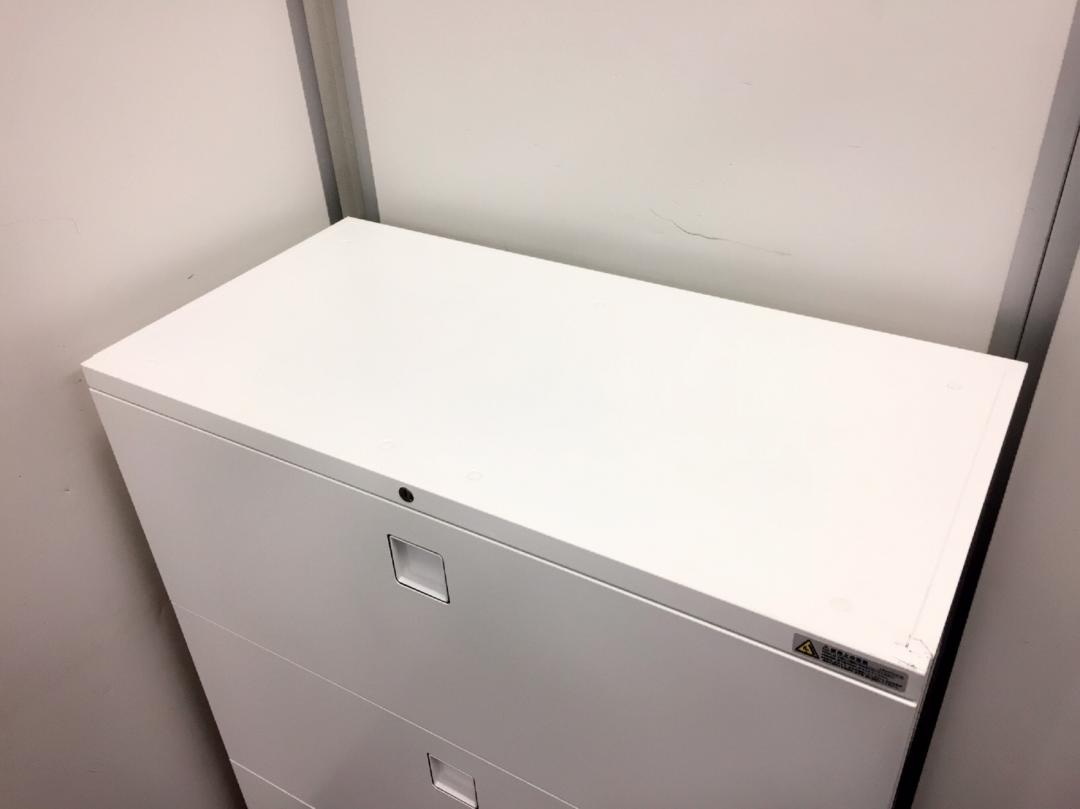 オカムラ レクトライン 3段ラテラル書庫 ホワイト天板 シリンダー錠 鍵付き ※取っ手部分に若干日焼けあり