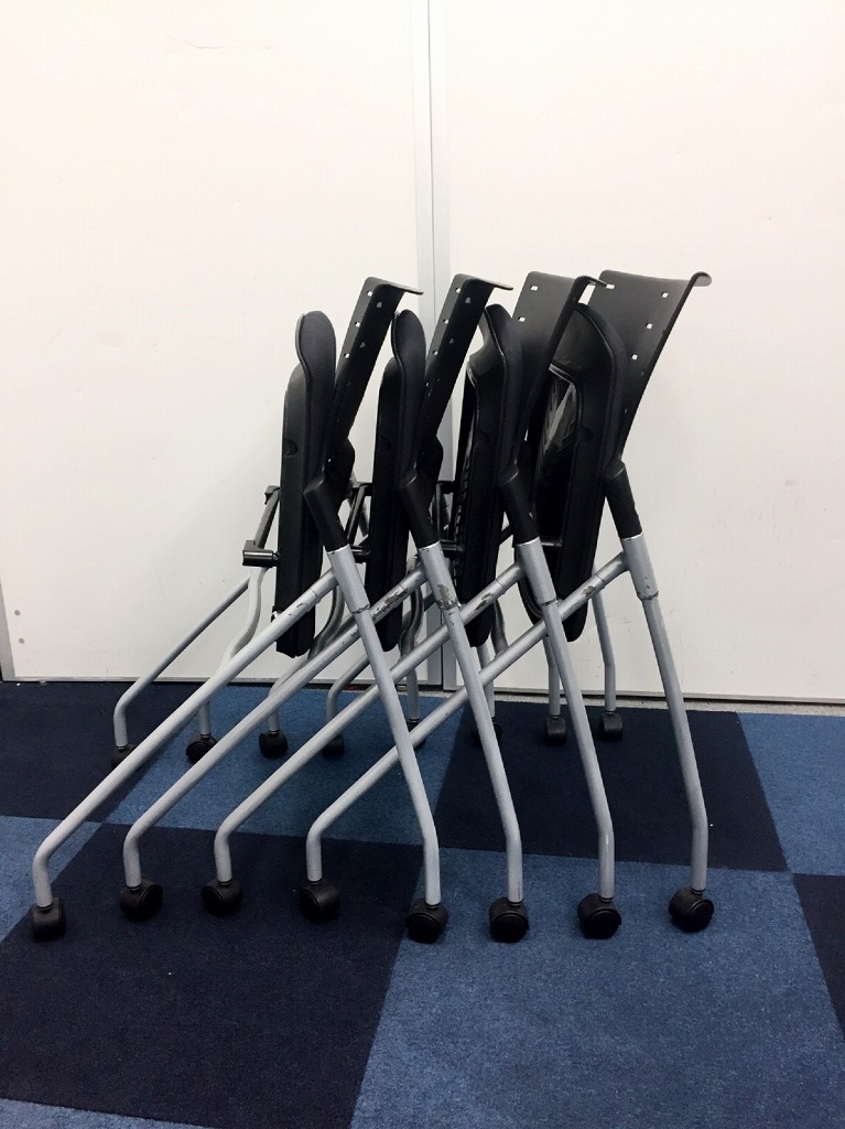 ①横にどんどんネスティング(座面を跳ね上げて平行に収納)できる為、