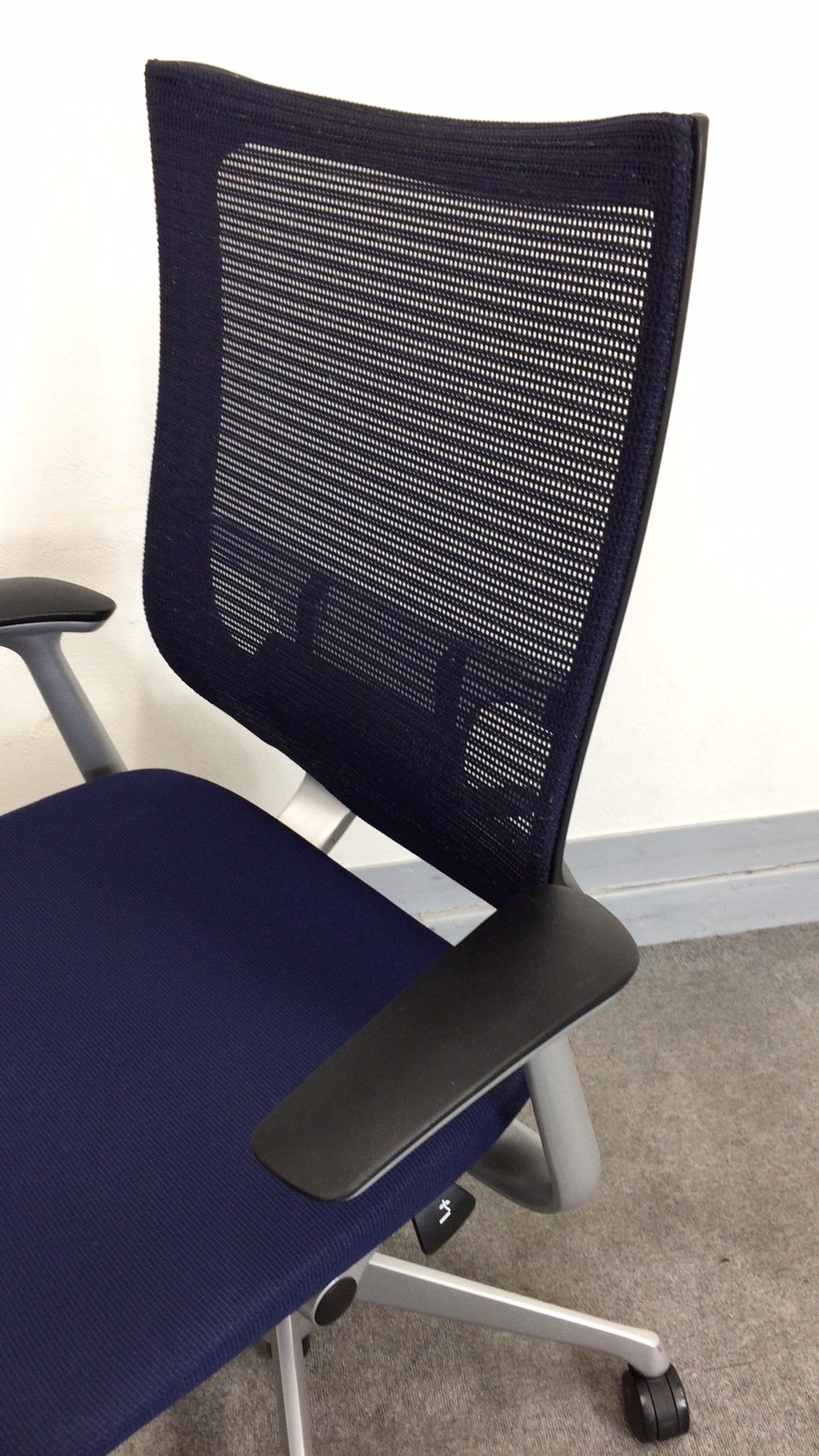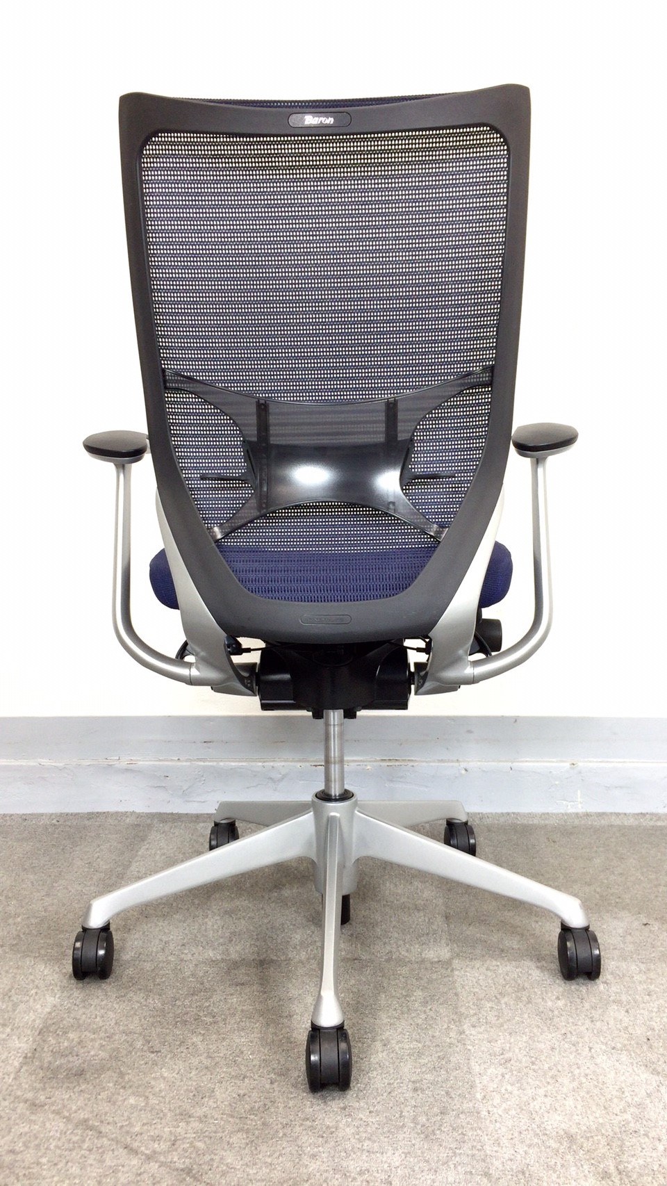 【オフィスの執務室、会議室におすすめ!】■オカムラ(okamura)製 バロン(Baron)チェア 肘付き ハイバック 背面メッシュ ■可動肘 ■ダークブルー × ホワイトシェル【硬めの座面が大人気!国産メッシュチェアの代表格!】【状態良好品!】