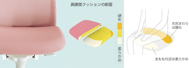- 座った瞬間の衝撃を吸収するブリッジベンディングシート採用。長時間の着座でも臀部が座面にすっぽり収まり、心地よさが持続。