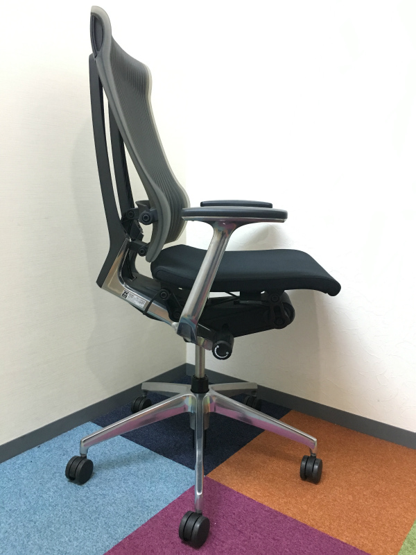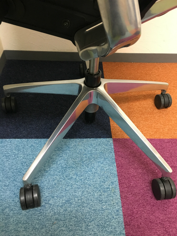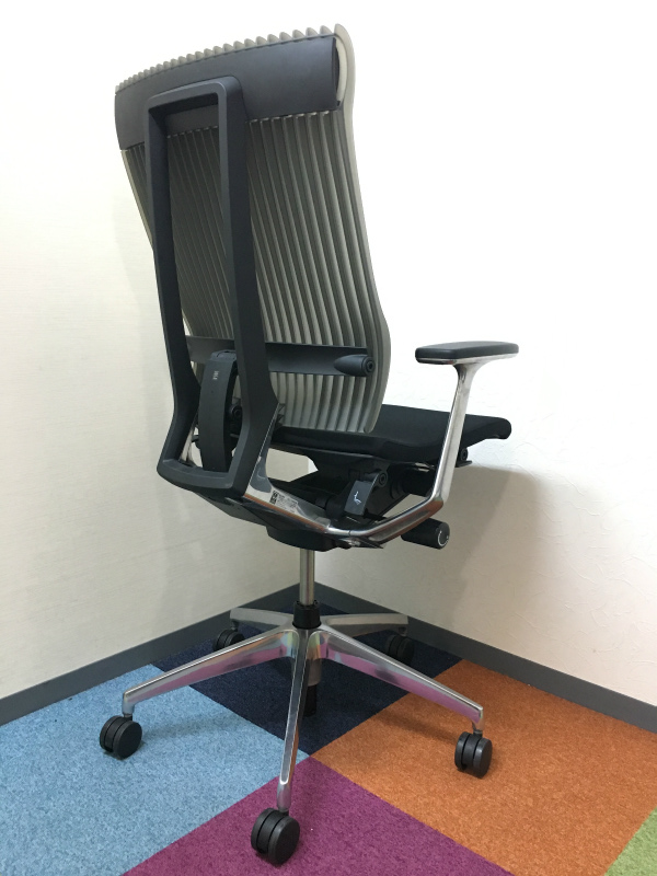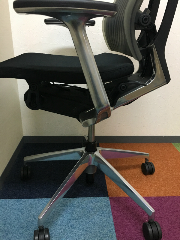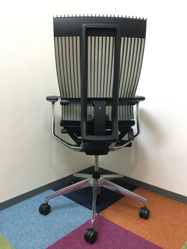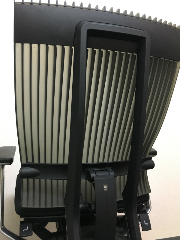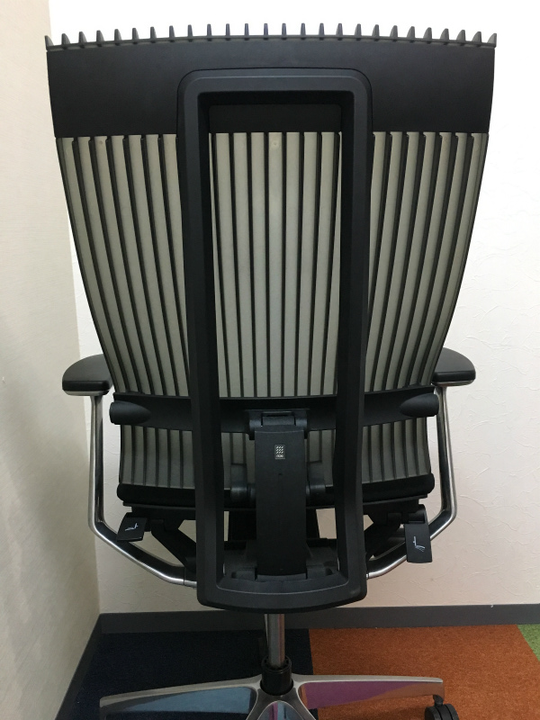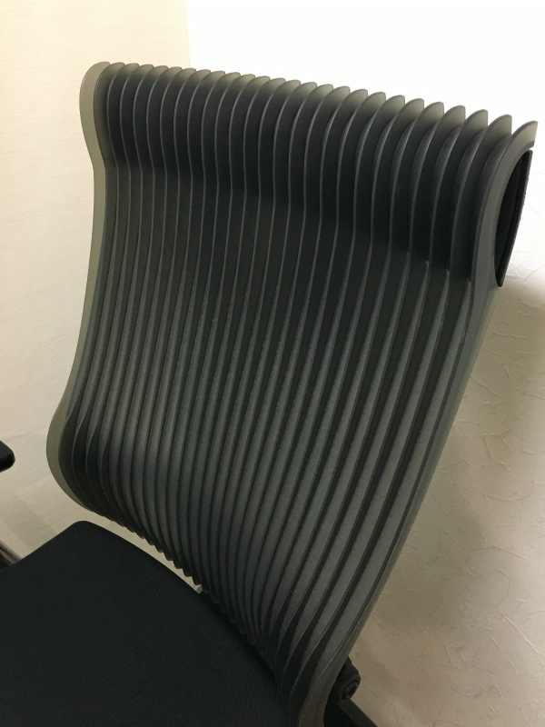 見た目は少し硬そうに見えるエラストマー素材ですが、座ってみると程よいしなり具合のやわらかな座り心地で、背中が痛くなるようなことはまるでありません。面ではなく線で支えることで、背面の通気性の良さは抜群です。