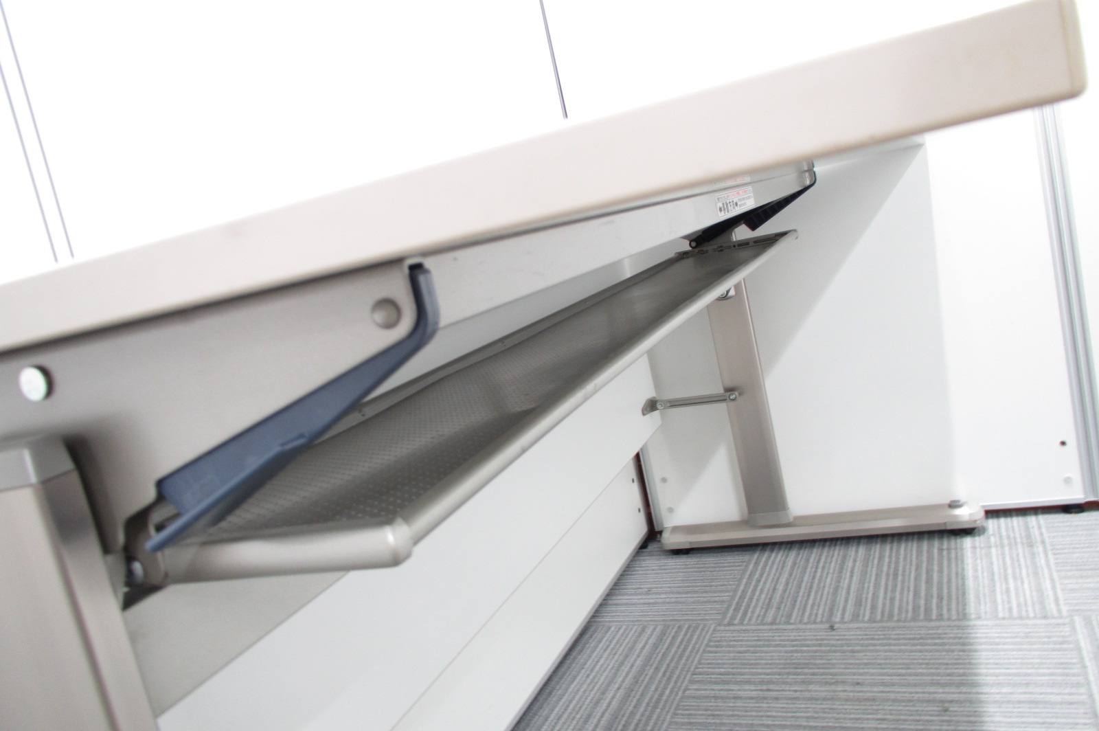 - 一部不具合あり天板歪み、アジャスター無し、キャスター使用不可ようなそのテーブルの本来の効用を果たすための機能以外の一部が使用不可な状態。(例、キャスターロッ ク機能使用不可、棚板無し等がある。)