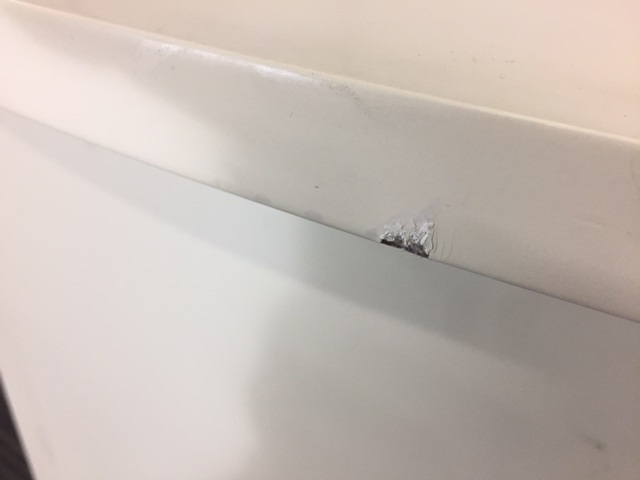 - 目立つ箇所あり傷・凹みが多数、深い傷・凹みが一部ある。(例、天板、正面、背後、サイド部分にある。)