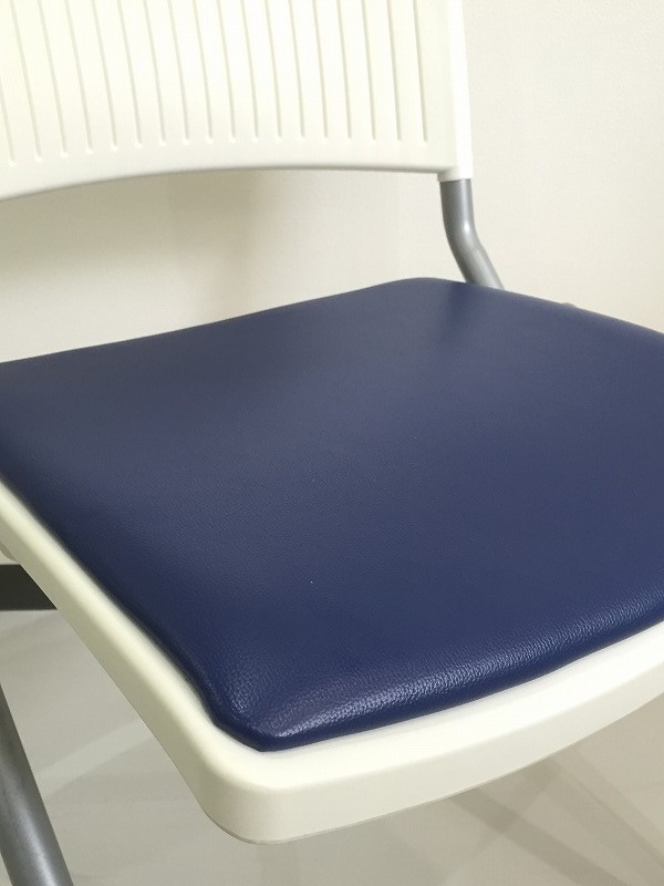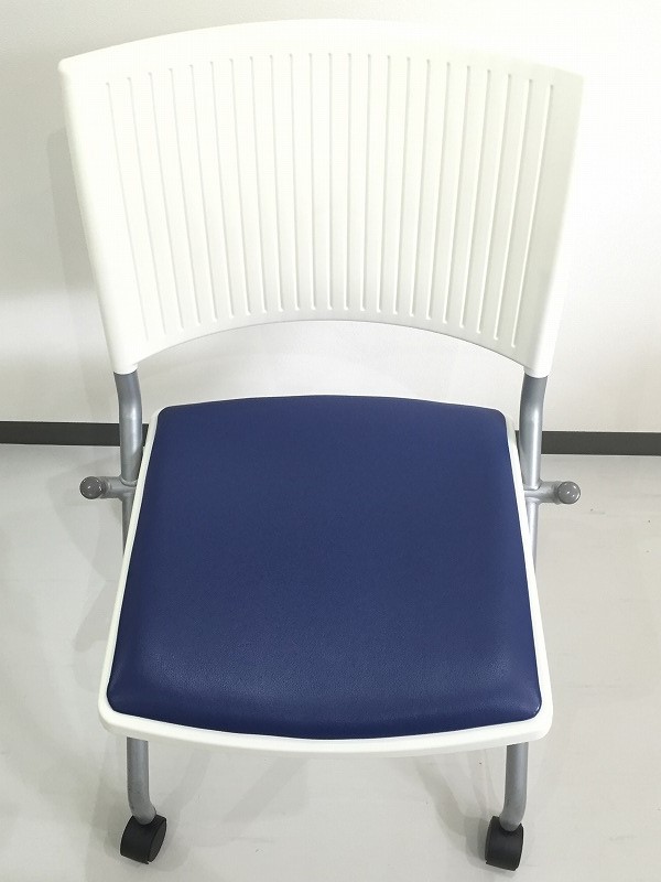 背樹脂のホワイトデザインがすっきりした印象のミーティングチェア「FJC-K6」肘なし/ネイビー。座はPVCレザー仕様のネイビーに背樹脂ホワイトのツートンカラー。背のカーブした形状が身体に程よくフィットします!