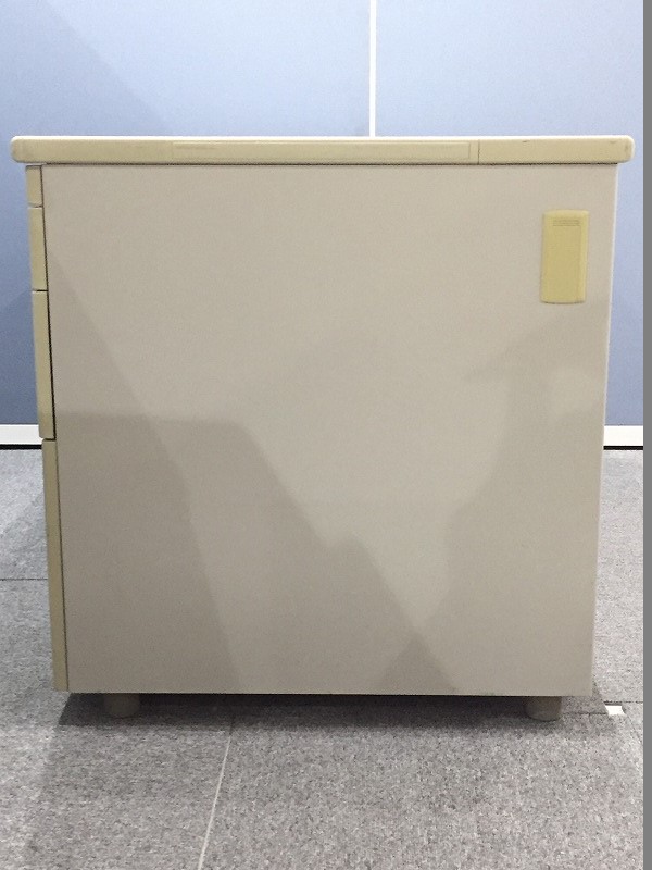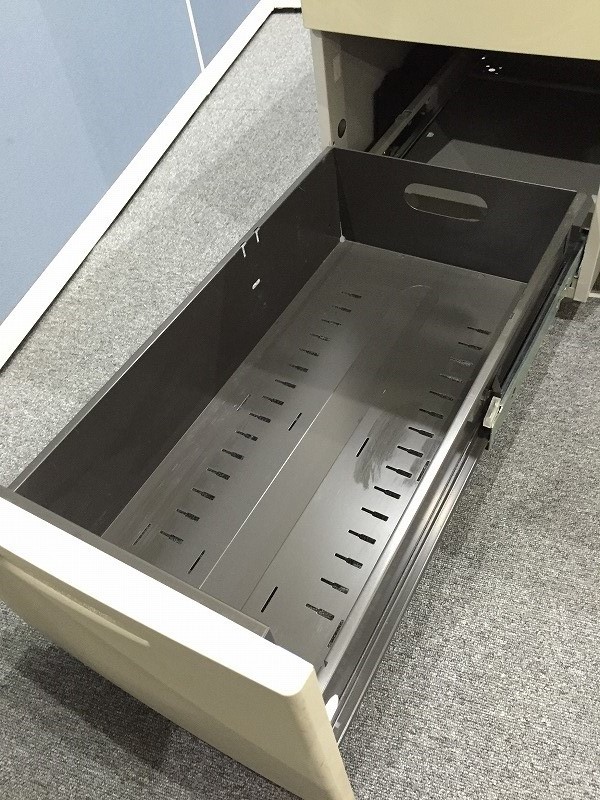 - 袖机のワゴンは、最下段がロング引出しになっており、従来より収納力120%アップ。