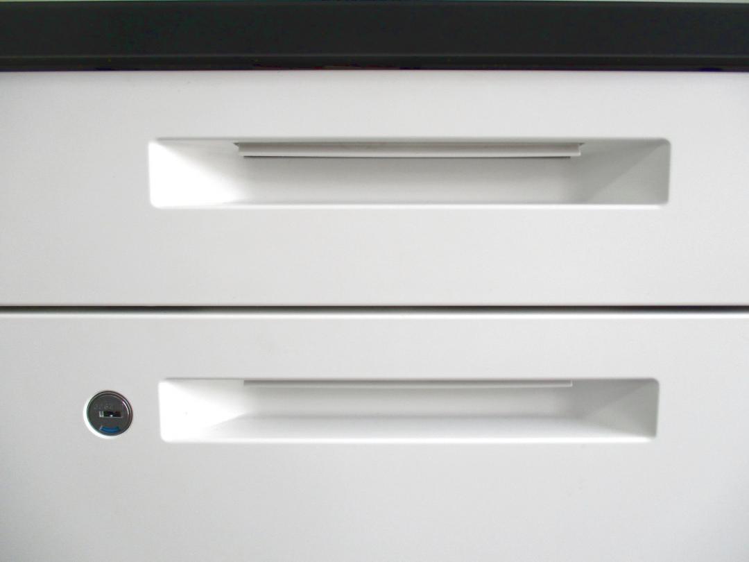 - 地震時、センター引出しが飛び出さないよう、ラッチ機構を装備。脚はデスクの横ズレを軽減させる設計になっています。