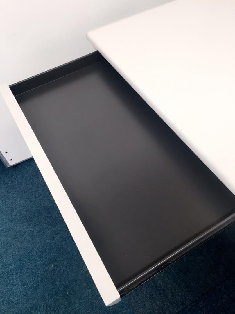 - 袖机のワゴンは、最下段がロング引出しになっており、従来より収納力120%アップ。
