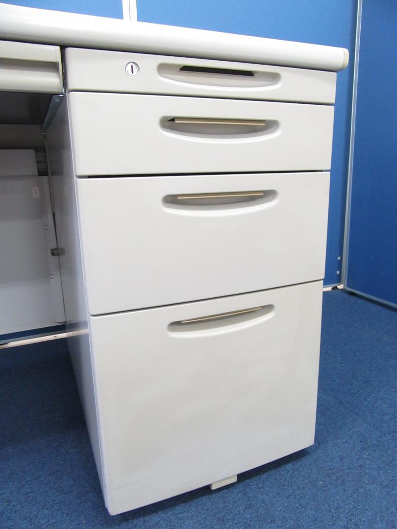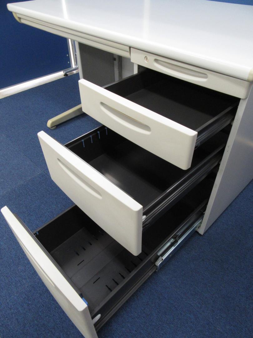 - 袖机のワゴンは、最下段がロング引出しになっており、従来より収納力120%アップ。