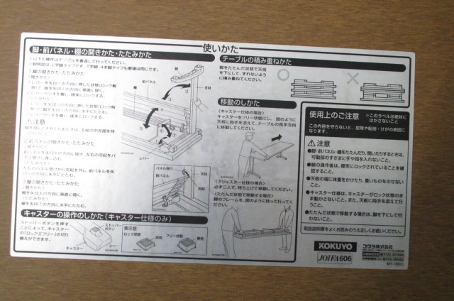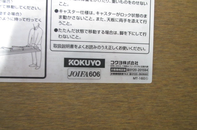 - 一部不具合あり天板歪み、アジャスター無し、キャスター使用不可ようなそのテーブルの本来の効用を果たすための機能以外の一部が使用不可な状態。(例、キャスターロッ ク機能使用不可、棚板無し等がある。)
