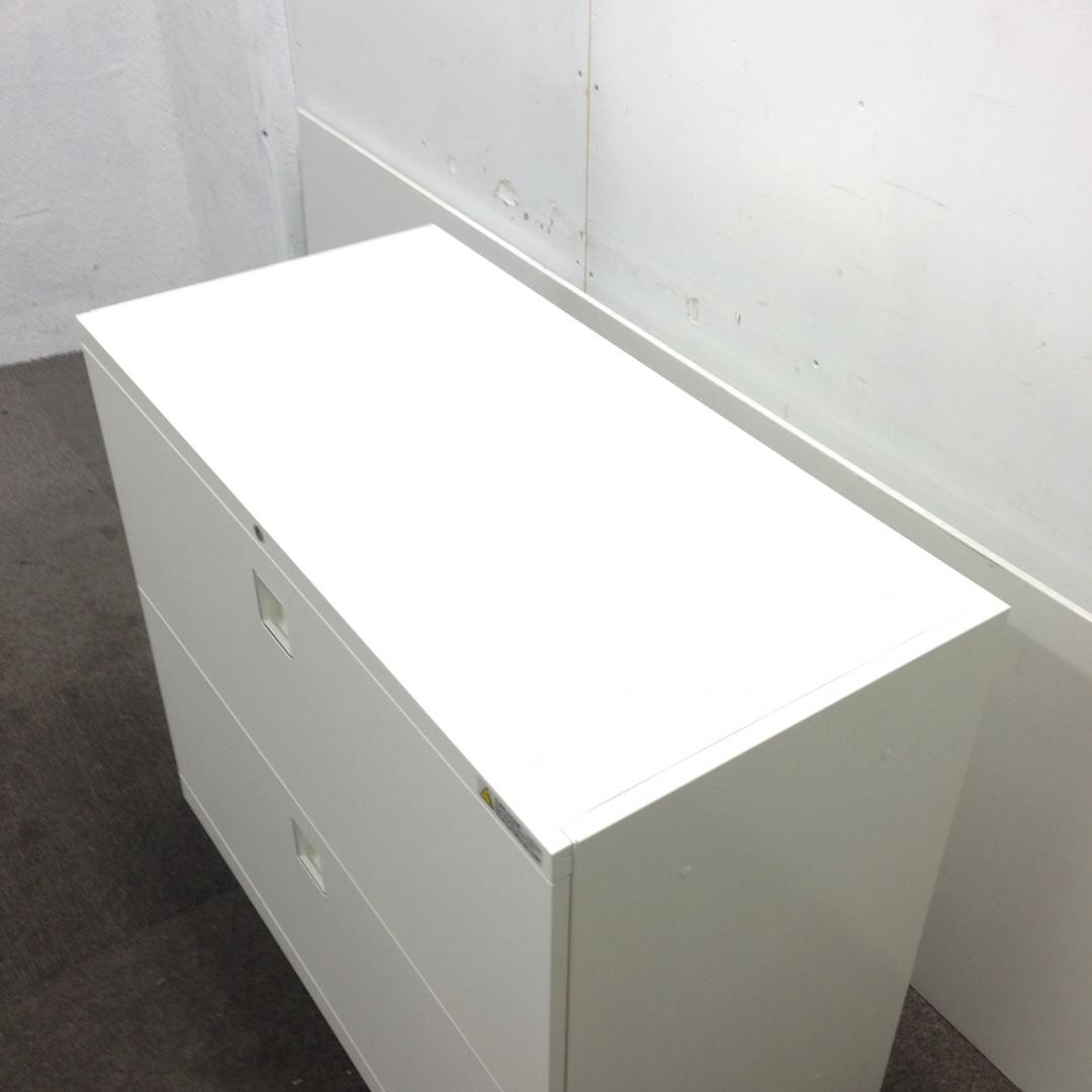 オカムラ レクトライン 3段ラテラル書庫 ホワイト天板 シリンダー錠 鍵付き ※取っ手部分に若干日焼けあり