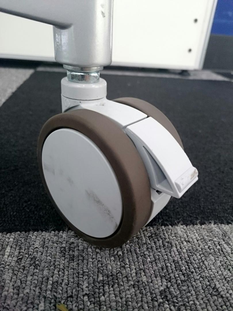 - 一部不具合あり天板歪み、アジャスター無し、キャスター使用不可ようなそのテーブルの本来の効用を果たすための機能以外の一部が使用不可な状態。(例、キャスターロッ ク機能使用不可、棚板無し等がある。)