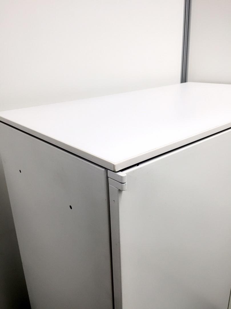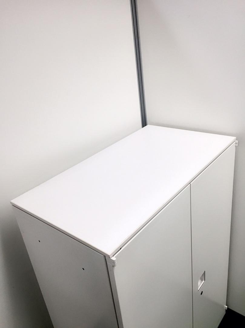 【オフィスの書類をスッキリ整理!取っ手がどの方向からでも開くマルチハンドル!】■オカムラ(okamura)製 レクトラインシリーズ 両開き書庫 ローキャビネット ■本体色:ホワイト ■シリンダー錠 ■ナチュラル天板付き