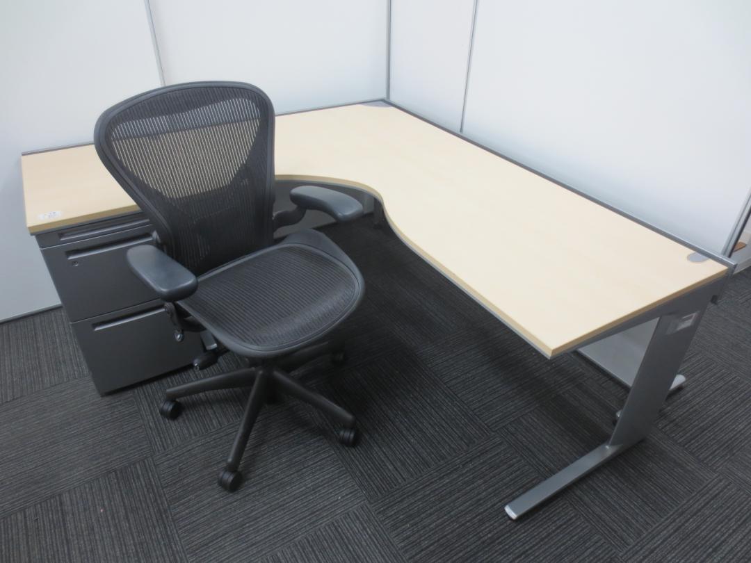【L型デスク&チェアセット】【岡村製作所(okamura)&スチールケース】■ナチュラル天板シルバーボディデスク■アーロンチェア■メッシュチェアの王様アーロンとのセットになります- 春日部・越谷店