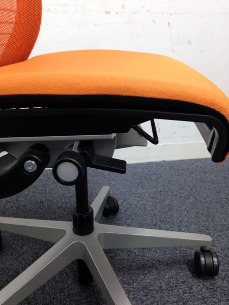 - レバーを引き上げながら座面を前後にスライドさせ、レバーを放すとロックします。背もたれに身体をつけた状態で膝の裏側と座面のエッジの間に5-8センチほどの隙間ができるのが理想的です。