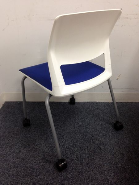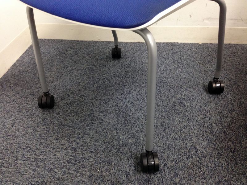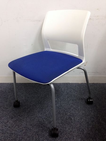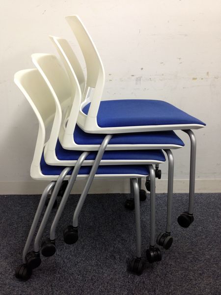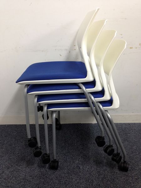 【3セット入荷】ブルー×ホワイトが鮮やかな、コクヨ製スタッキングチェア4脚セット!!キャスター付きで、出し入れや移動も楽々!!- 名古屋千種店
