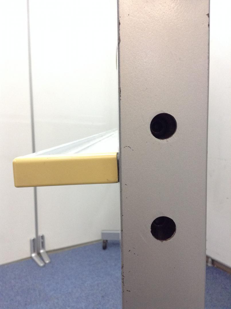 - かなり強い濃い黄ばみ・変色が商品全体にある。(例、板面、受け、サイド部分、脚部にある。)