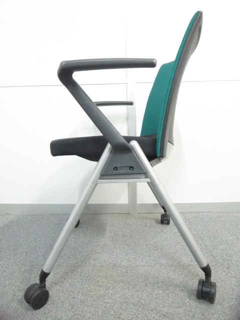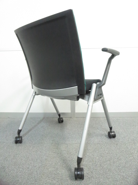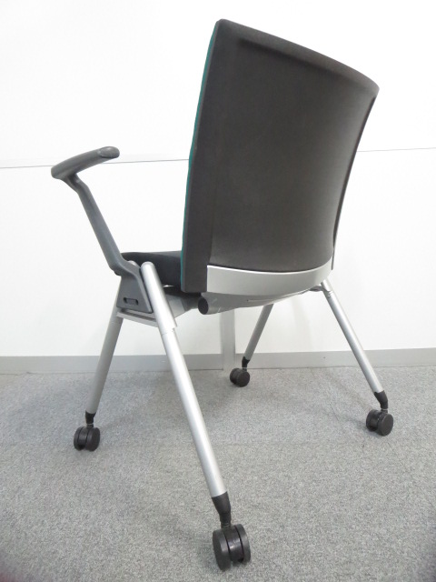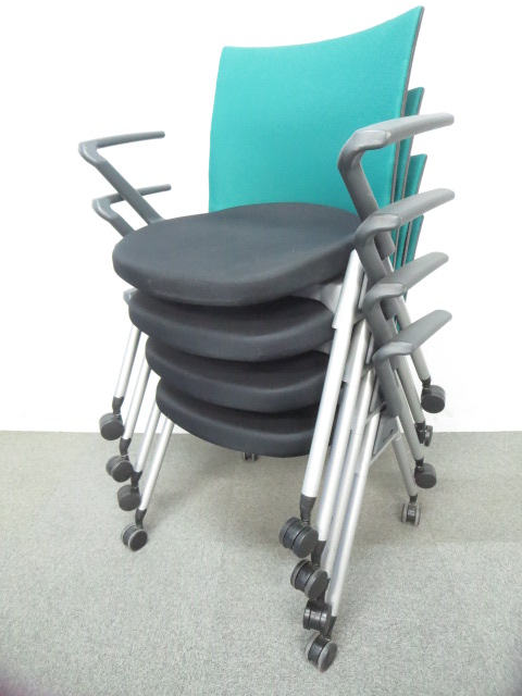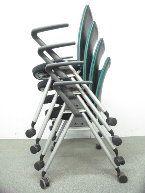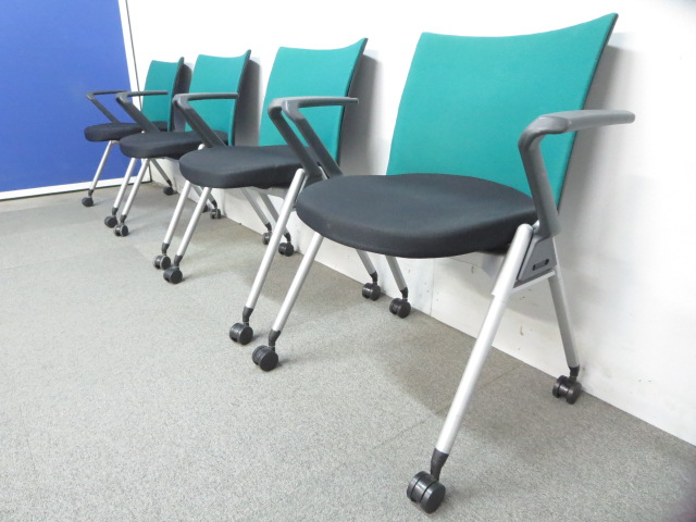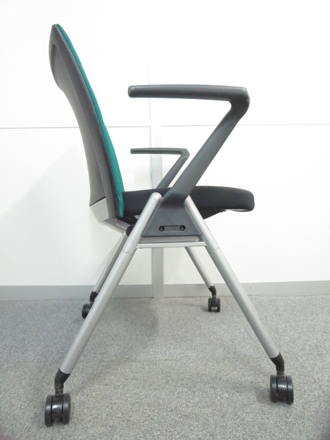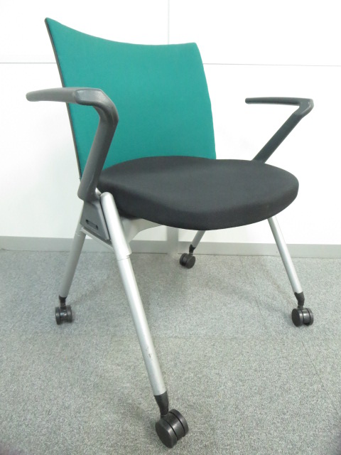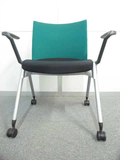 【リラックスできる肘付タイプ!】■ウチダ スタッキングチェア グリーン ■スムーズに動かせるキャスター付- 川崎店