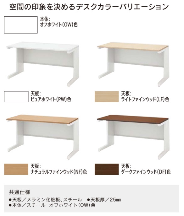 - デスクの幅だけではなく、奥行き・高さ・脚のタイプも選べます。天板は木目タイプもあります。