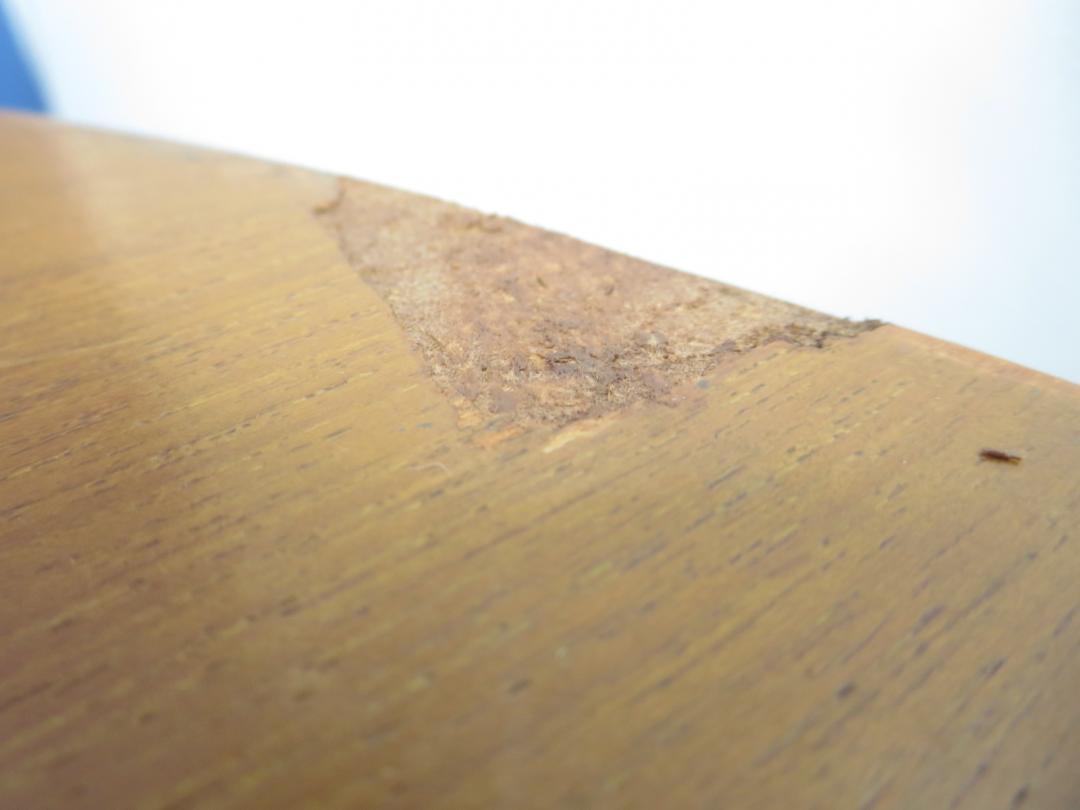 - あり黄ばみ・変色が広い範囲にうっすらある、または濃い黄ばみ・変色が一部ある。(例、天板、幕板、棚板、サイド部分、脚部等にある。)