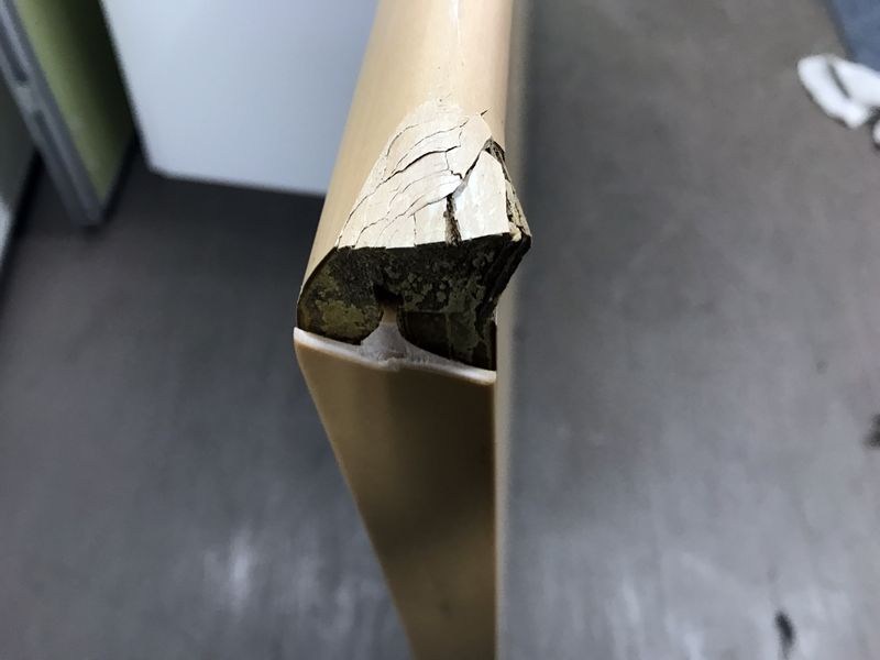 - かなり強い濃い黄ばみ・変色が商品全体にある。(例、天板、幕板、棚板、サイド部分、脚部等にある。)
