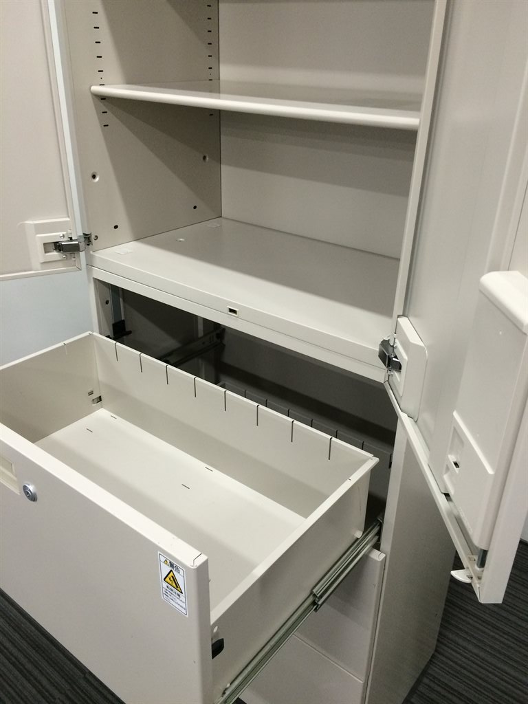 - 一部不具合ありそ引出の開閉不可、施錠不可、棚板無しといったの書庫の本来の効用を果たすための機能以外の一部が使用不可(例、扉、引出の開閉がしづらいなどがある。 )
