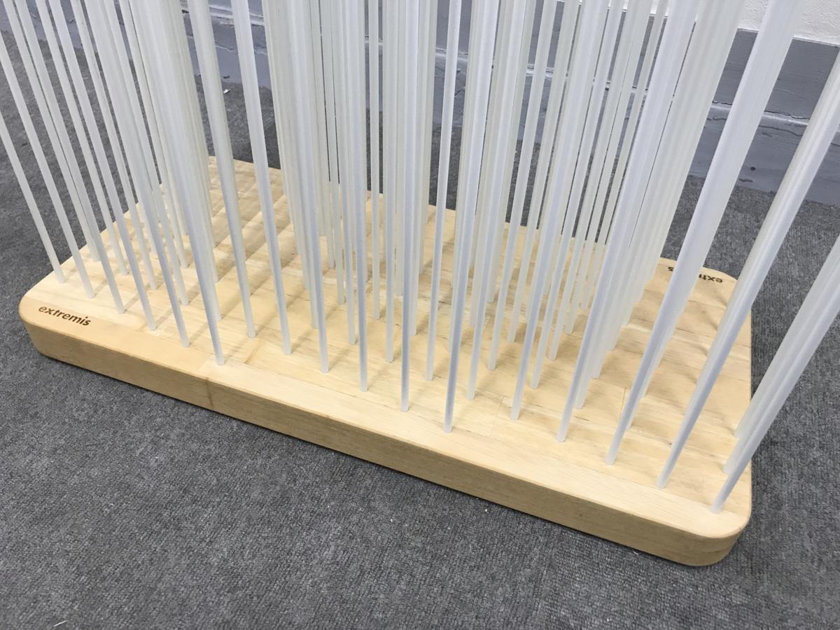 ラバー製のベースにグラスファイバーのスティックを挿すユニークな構造のパーティション。空間につながりを持たせつつ、ゆるやかに空間を仕切り、絶妙の空間を作り出します。 ベースの穴の位置も計算されていて、意外にも向こう側が見えづらいです。