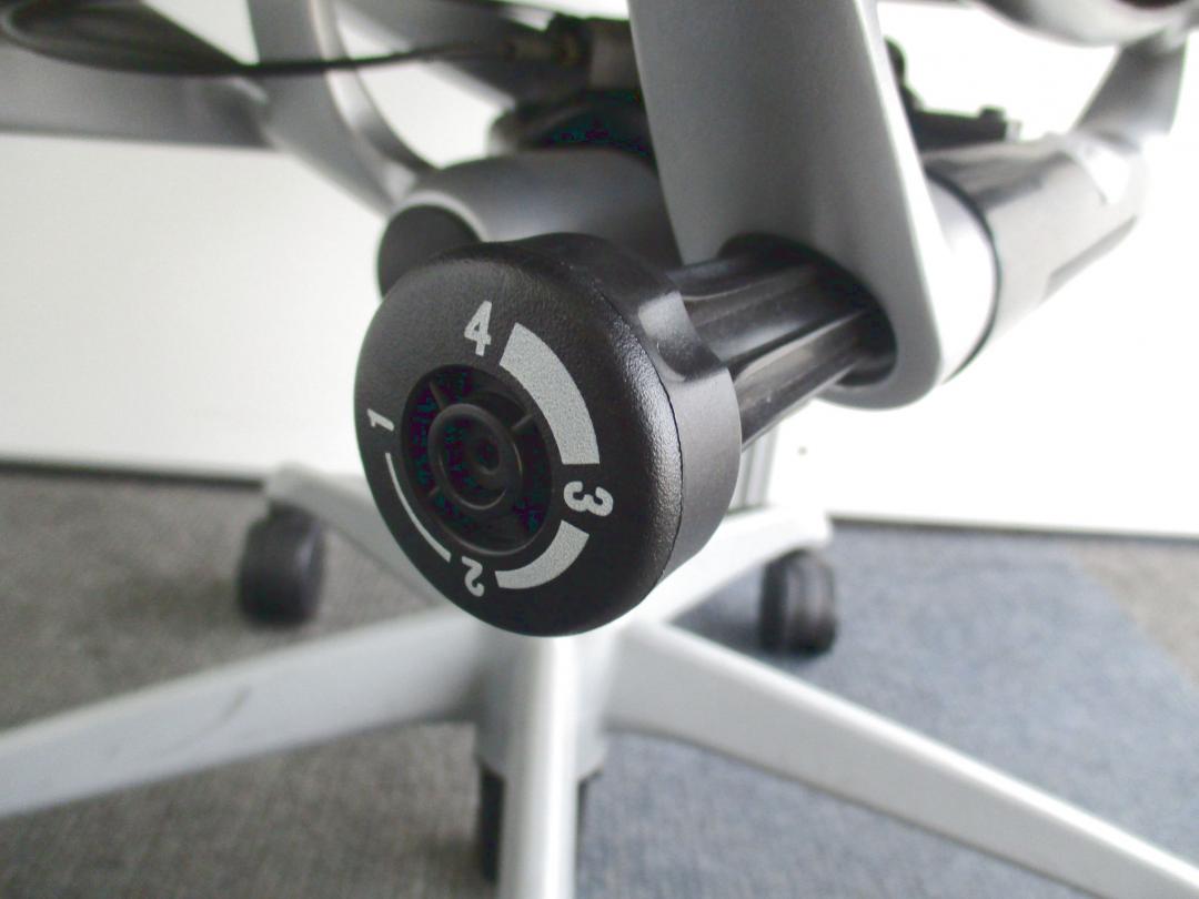 - ロッキングの強弱を調整するダイヤルがございます。体型に合わせてリクライニングの固さを座ったままで調整できます。