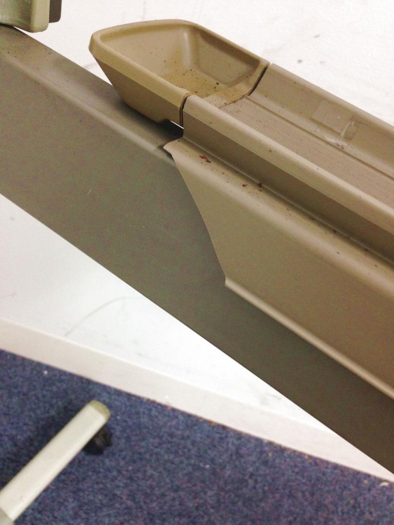 - かなり強い濃い黄ばみ・変色が商品全体にある。(例、板面、受け、サイド部分、脚部にある。)