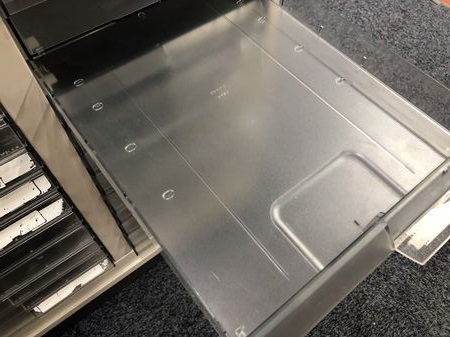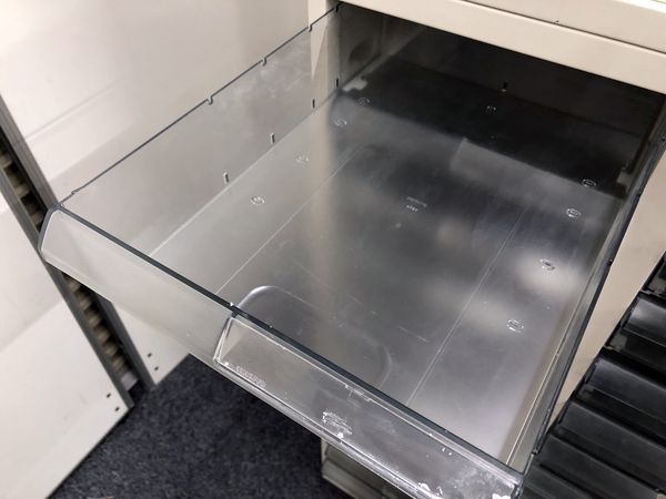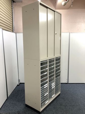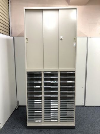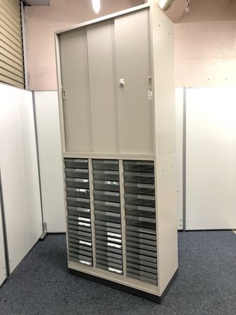 下置:トレー書庫(全48段):浅型10段×3列、トレー深さ:34㎜。