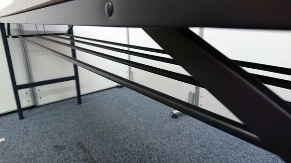 - 一部不具合あり天板歪み、アジャスター無し、キャスター使用不可ようなそのテーブルの本来の効用を果たすための機能以外の一部が使用不可な状態。(例、キャスターロッ ク機能使用不可、棚板無し等がある。)