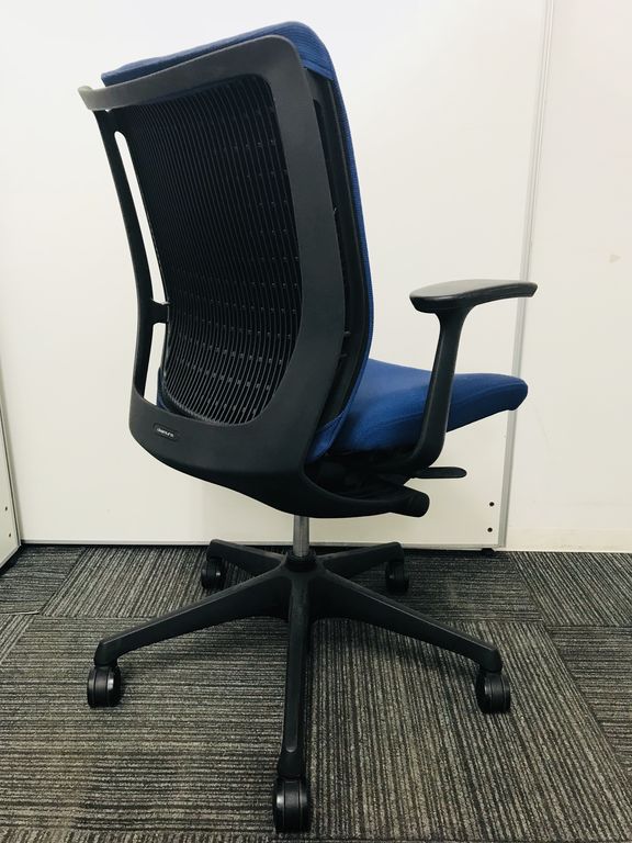 【人間工学に基づいた快適な座り心地!背によりかかるとバックシェルのグリッドが変形し、やさしくワーカーの身体を支えます!】■オカムラ(okamura)製 ヴィスコンテチェア (Visconte) 肘付きローバック ■固定肘 ■ミディアムブルー×ブラックシェル