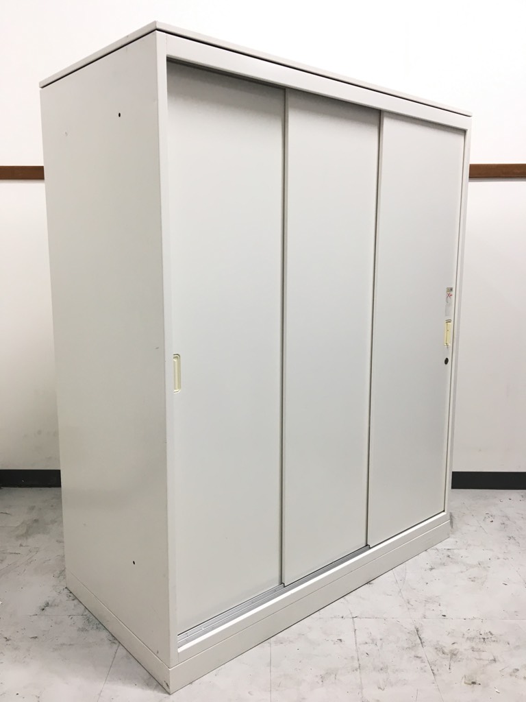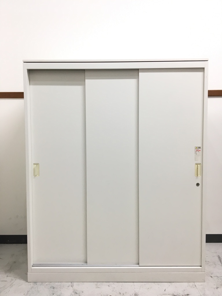 【物が取り出しやすい3枚引き違いタイプ!開閉スペースに困らない!】■オカムラ(okamura)製 レクトラインシリーズ 引違い書庫 3枚引き戸 ローキャビネット ■シリンダー錠 ■ホワイト