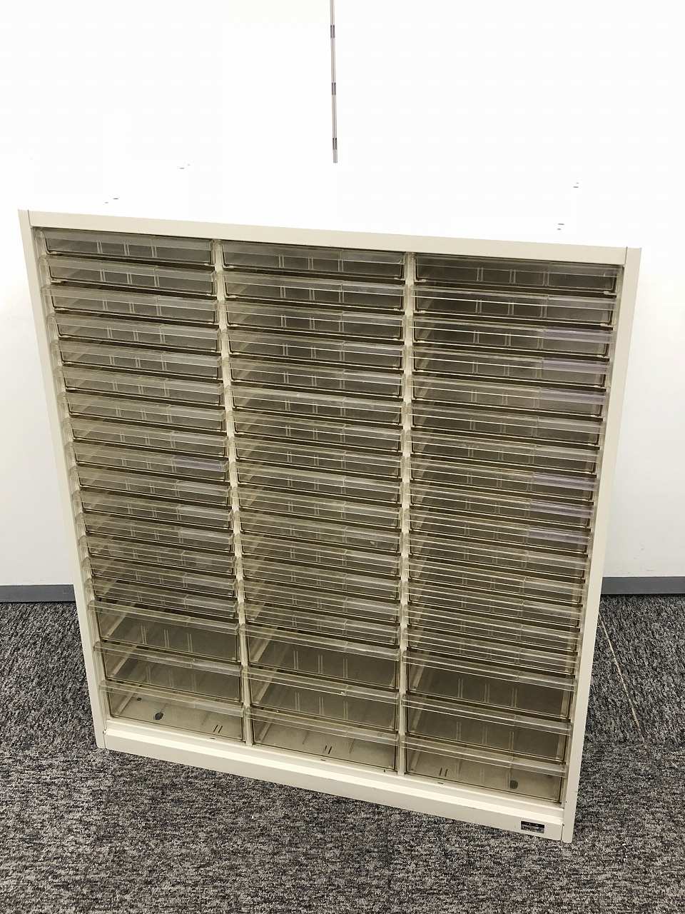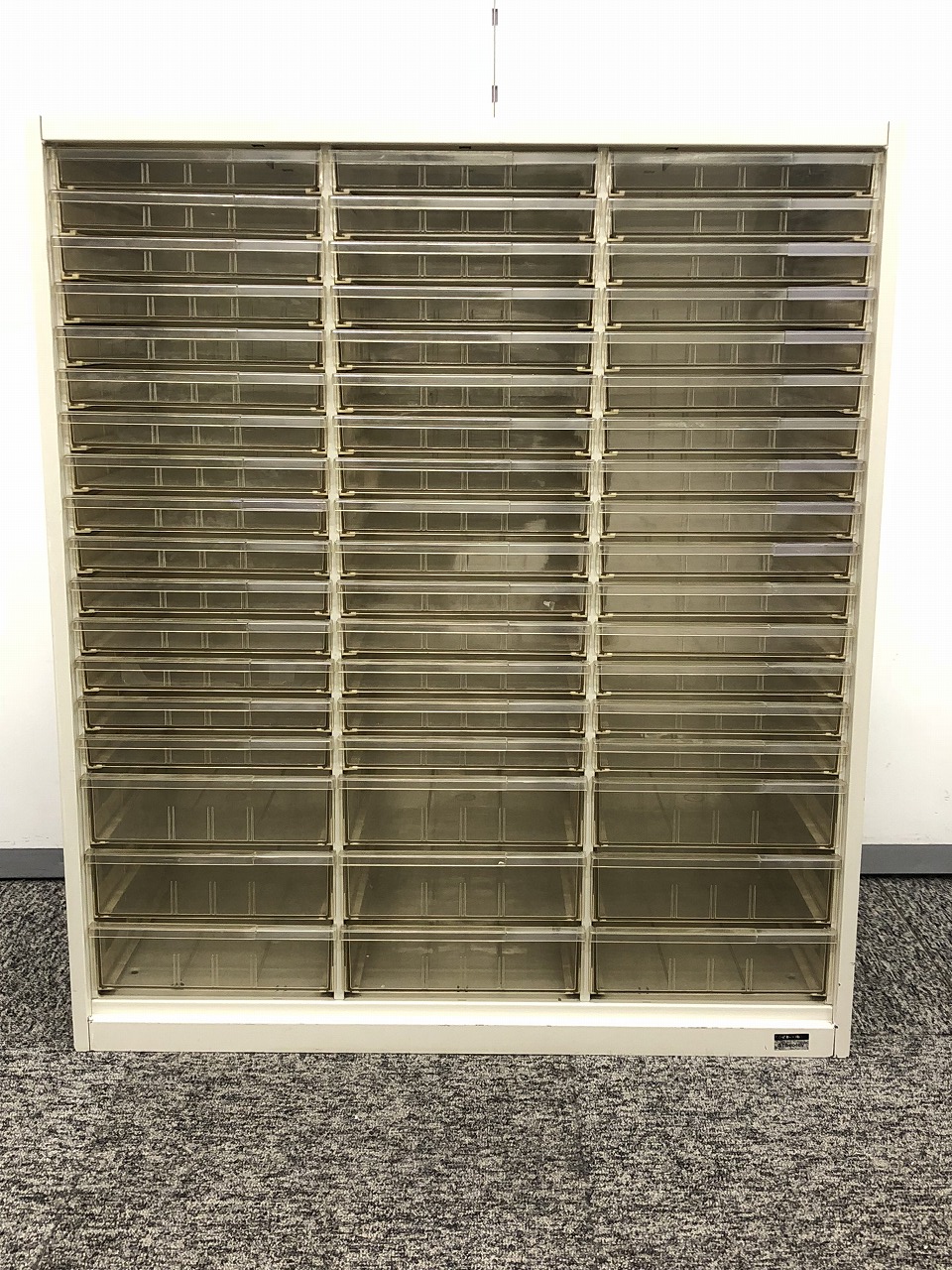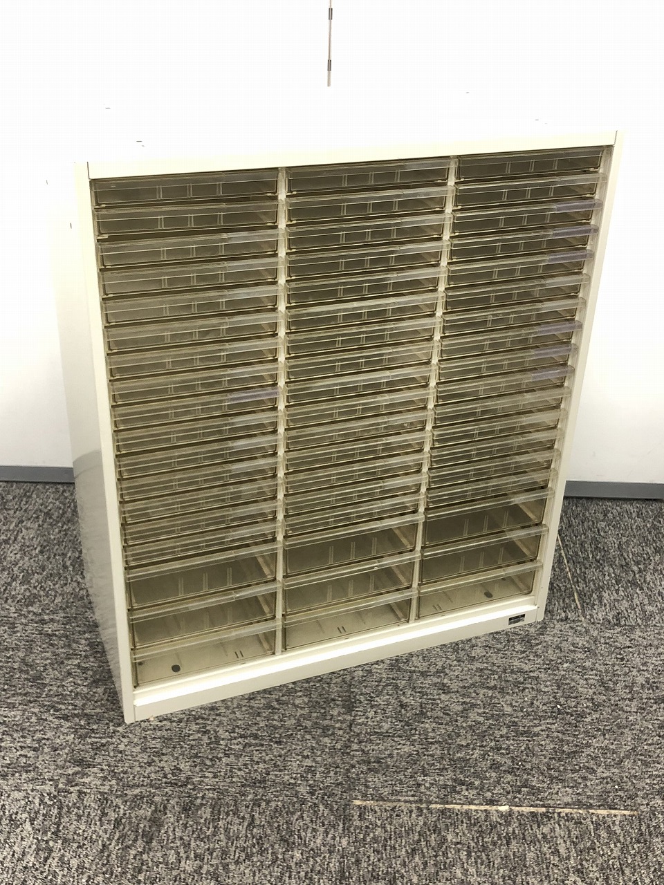 内寸が小さい物は15段で合計45個、大きい物は3段で合計9個引き出しがございます。