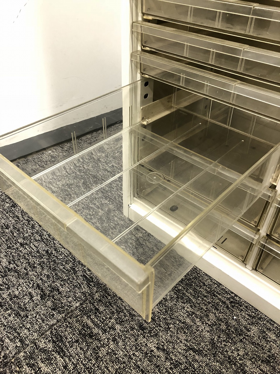 - 多数不具合あり引出の開閉不可、施錠不可、棚板無しといったその書庫の本来の効用を果たすための機能以外の多数が使用不可(例、扉、引出の開閉がしづらいなどがある。 )