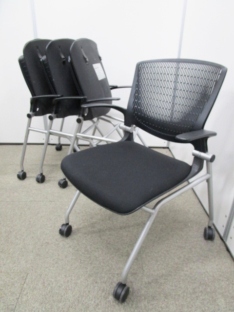 【倉庫在庫品】重ねてコンパクトに収納可能!ブラックメッシュタイプ!【肘付き】ミーティングチェア!【池袋店在庫品】- 立川・八王子店