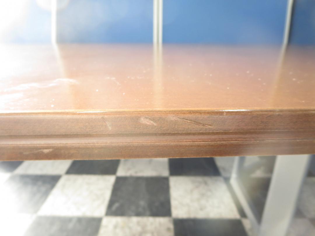 - 目立つ箇所あり傷・凹みが多数、深い傷・凹みが一部ある。(例、天板、幕板、棚板、サイド部分、脚部等にある。)