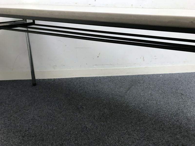 - 一部不具合あり天板歪み、アジャスター無し、キャスター使用不可ようなそのテーブルの本来の効用を果たすための機能以外の一部が使用不可な状態。(例、キャスターロッ ク機能使用不可、棚板無し等がある。)