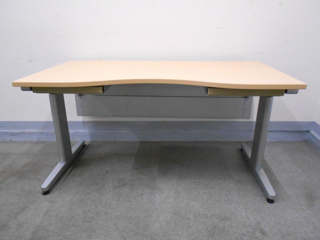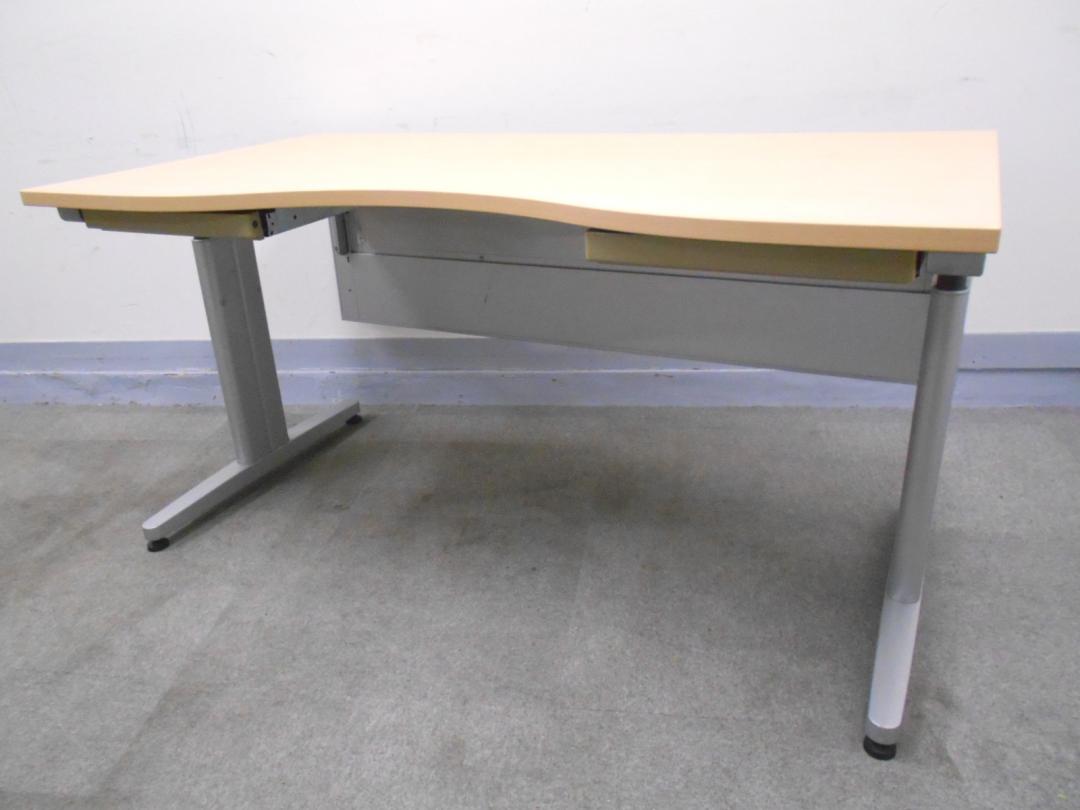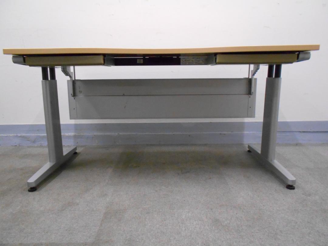 【KS】[商品入れ替えにつき値下げ中!][明るい木目でオフィスをカッコよく演出][幅1400㎜]平デスク スタンダードデスク ラウンドタイプ 引出し2か所付き[手動式天板高さ調節機能付き]- 茨城南店