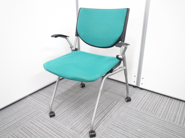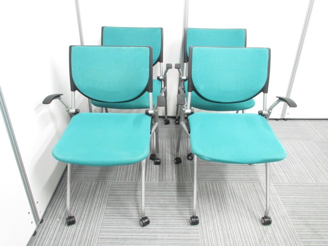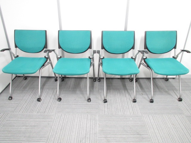 【4脚セット】【オカムラ製王道ネスティング肘付チェア!】明るいグリーンが魅力的なプロスタックチェア!早い者勝ち!- 在庫数