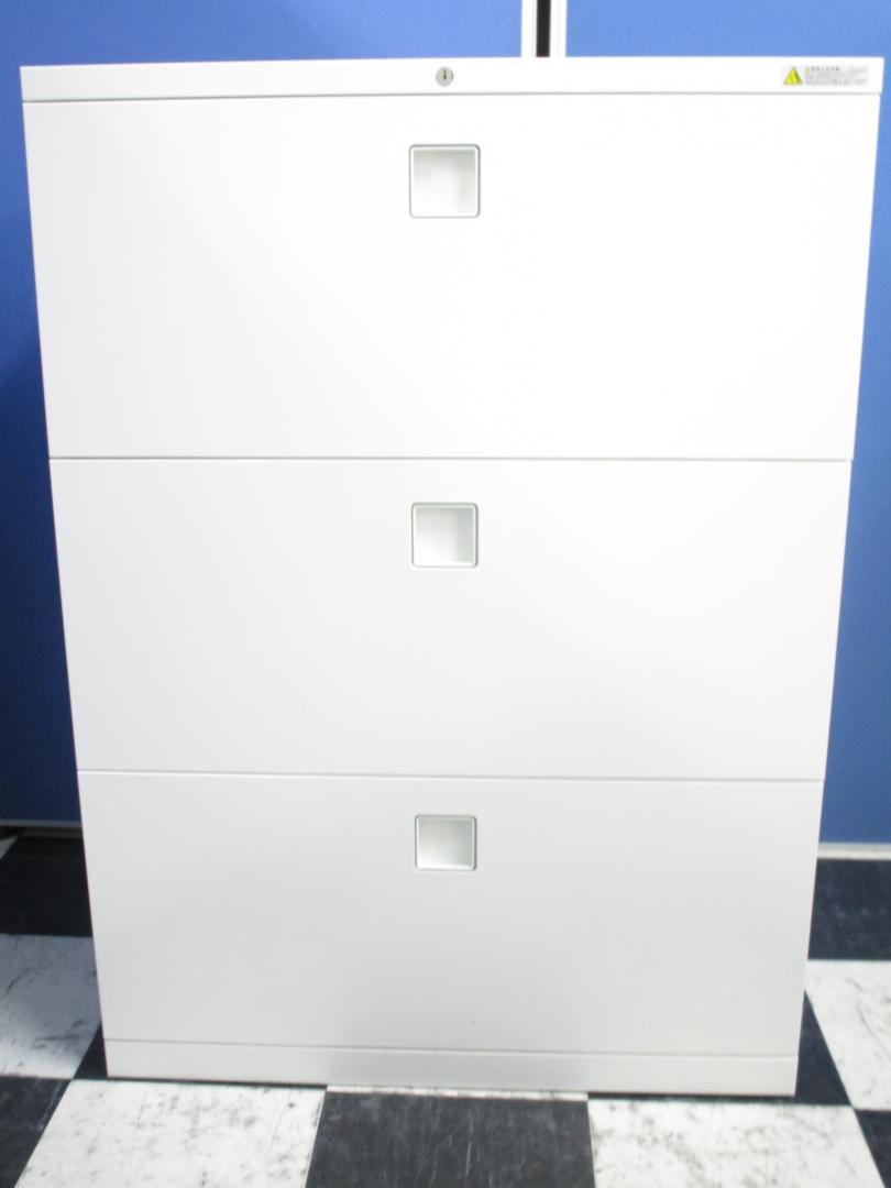 オカムラ レクトライン 3段ラテラル書庫 ホワイト天板 シリンダー錠 鍵付き ※取っ手部分に若干日焼けあり