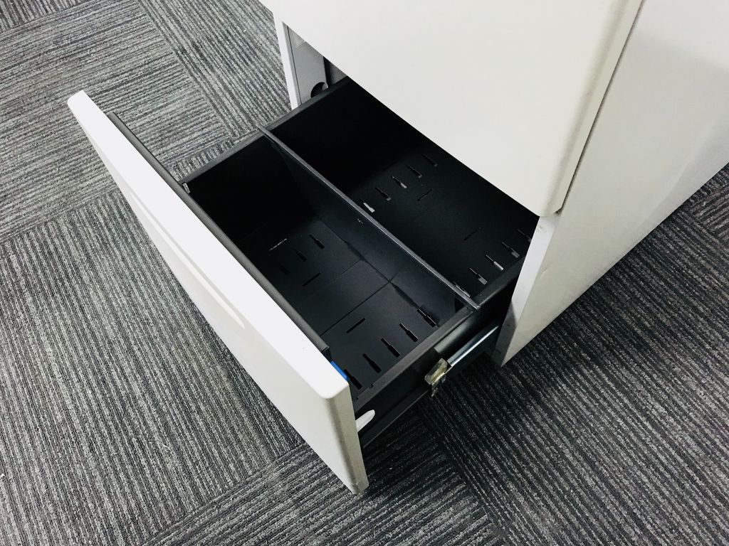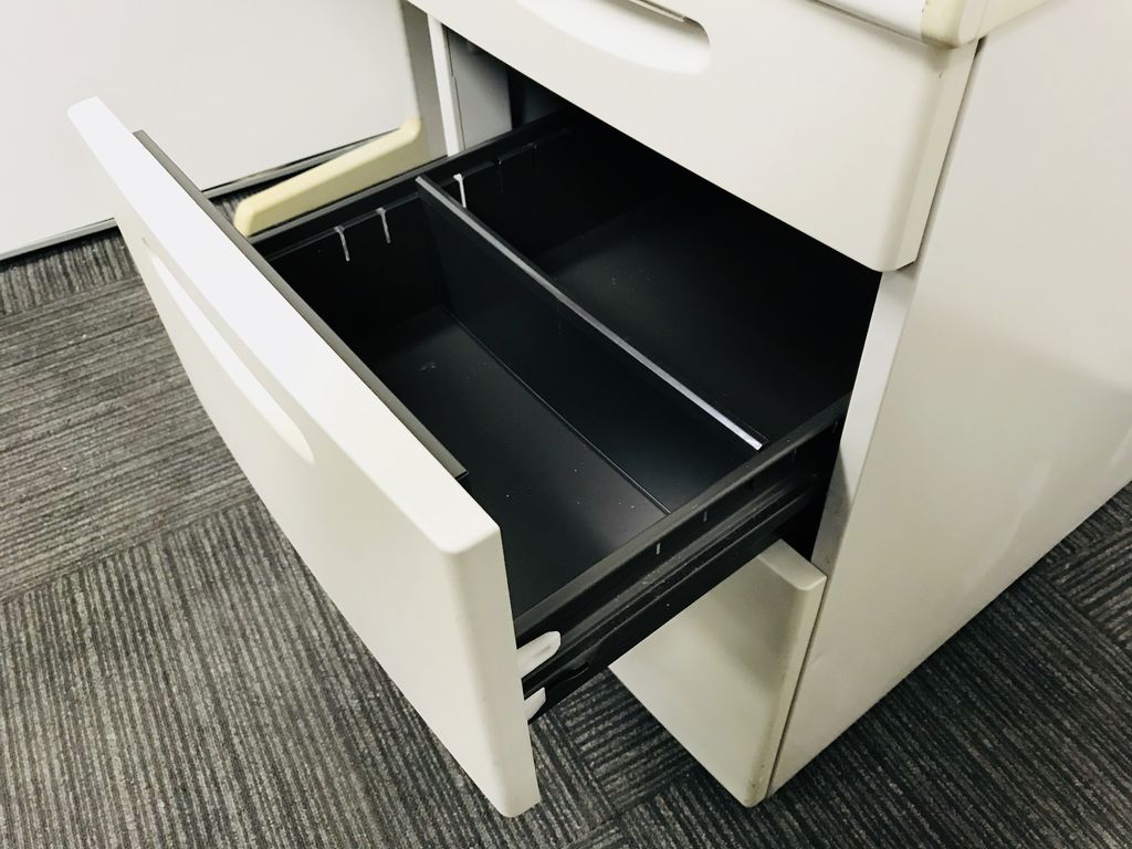 - 袖机のワゴンは、最下段がロング引出しになっており、従来より収納力120%アップ。
