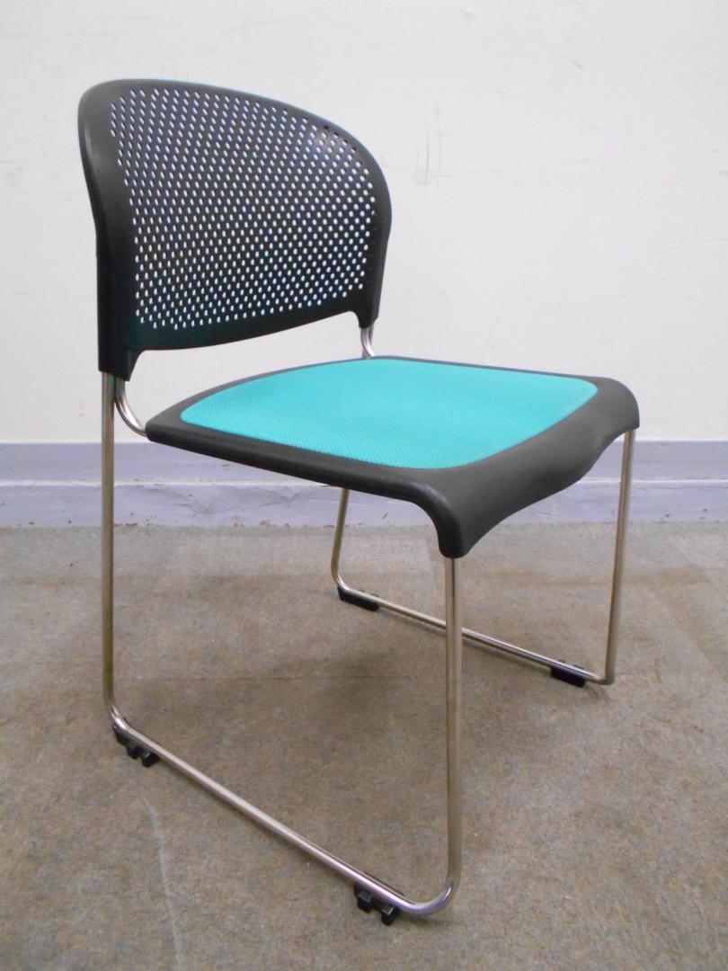 【KS】[使わない時は重ねて収納!!]オカムラ製スタッキングチェア グリーン 会議椅子 ミーティングチェア シルバー脚がスタイリッシュ!- 茨城南店