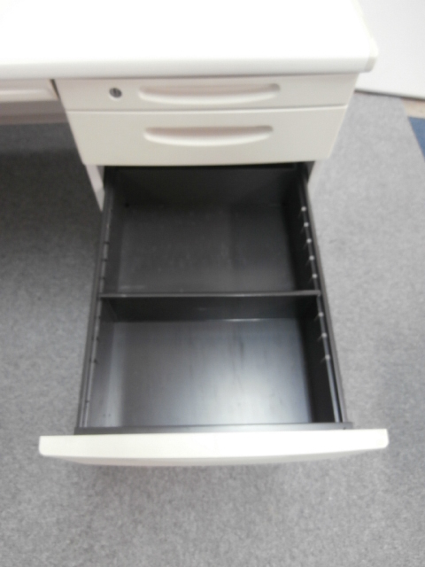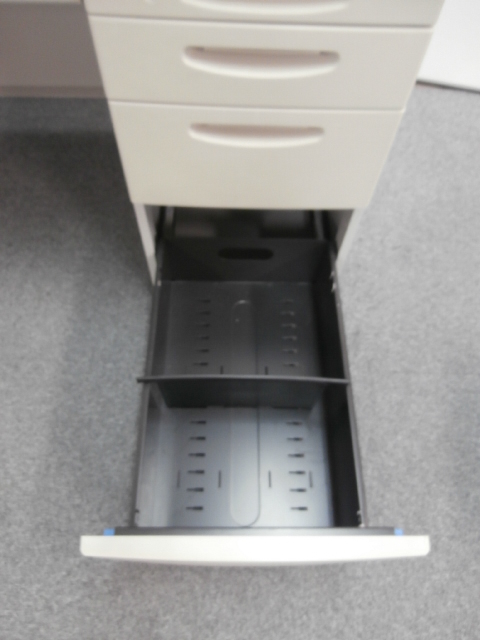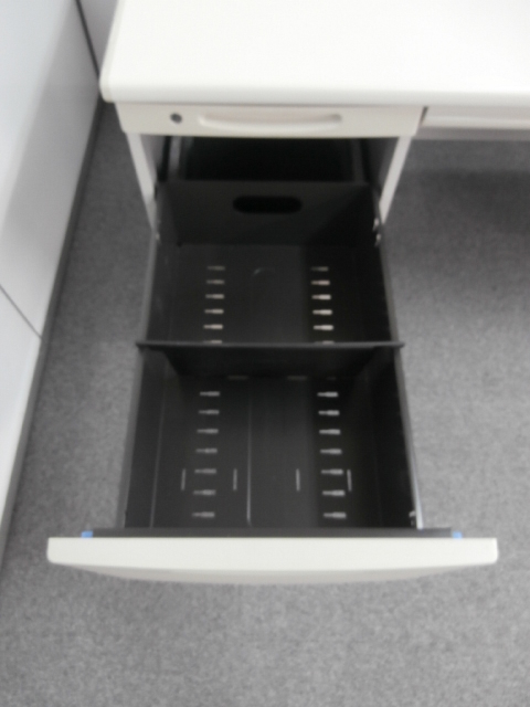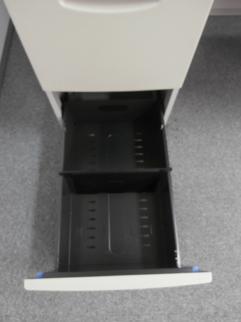 - 袖机のワゴンは、最下段がロング引出しになっており、従来より収納力120%アップ。