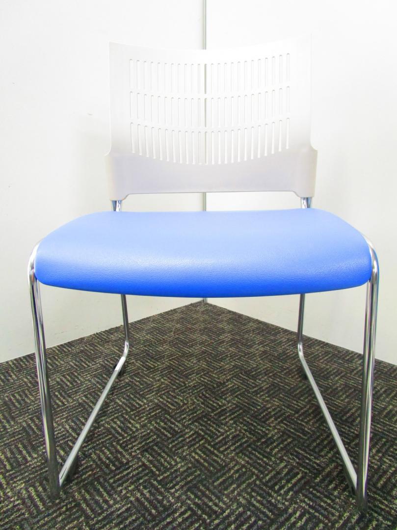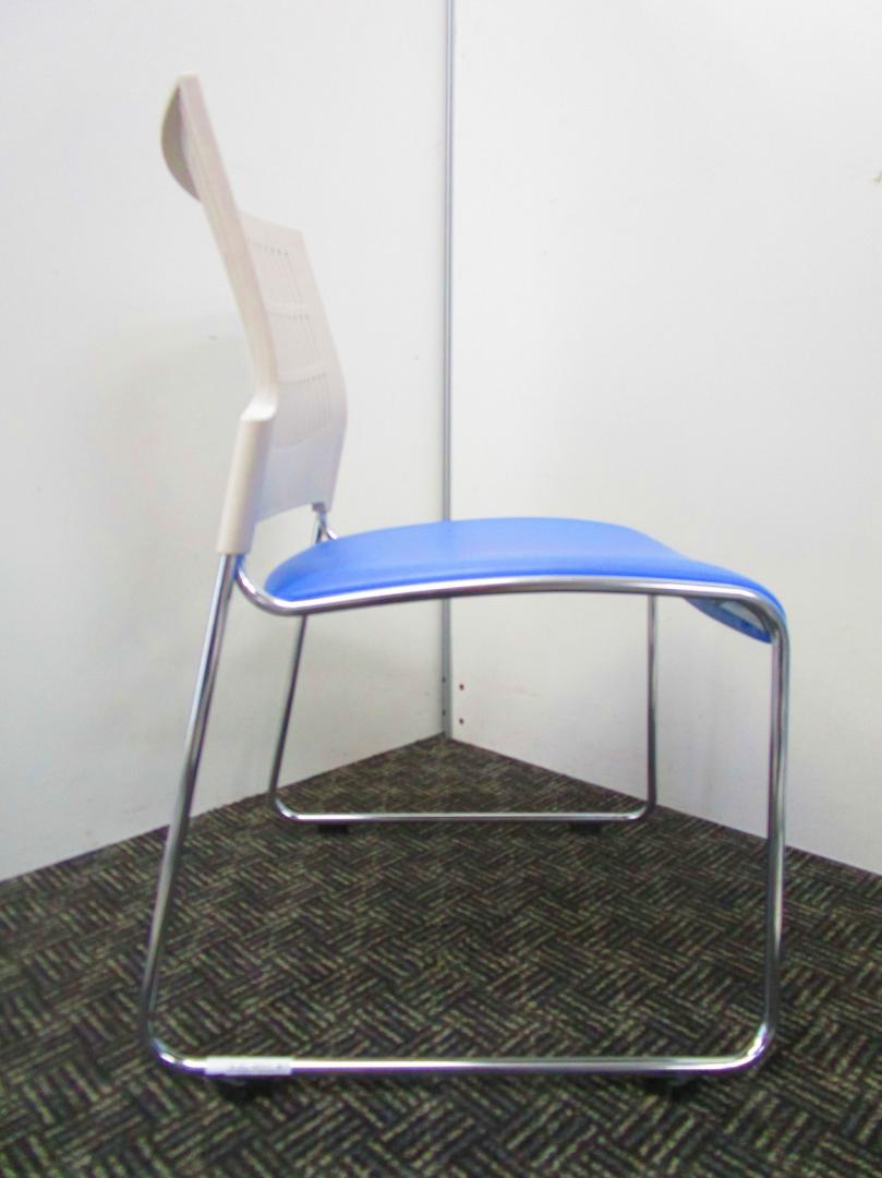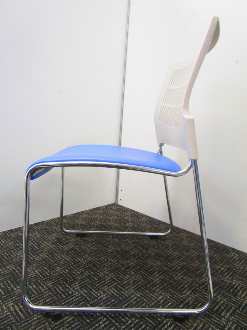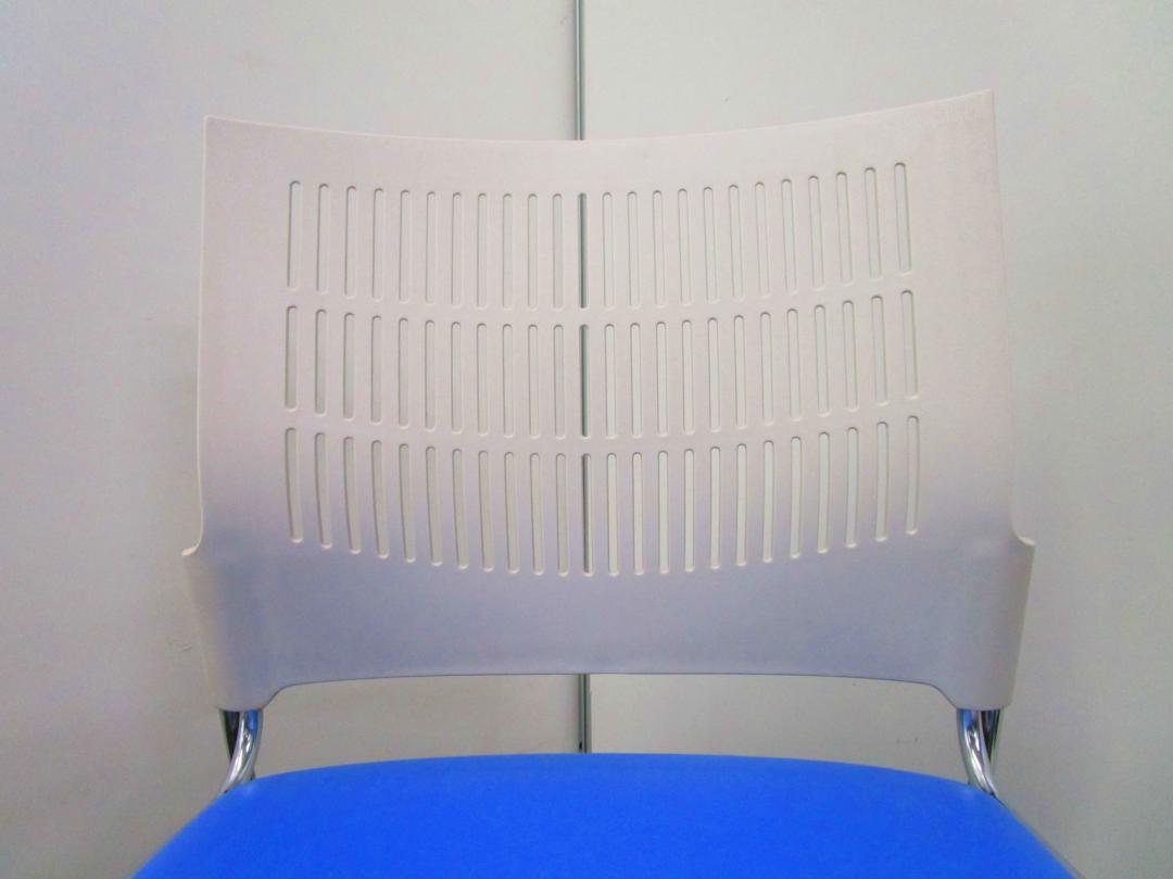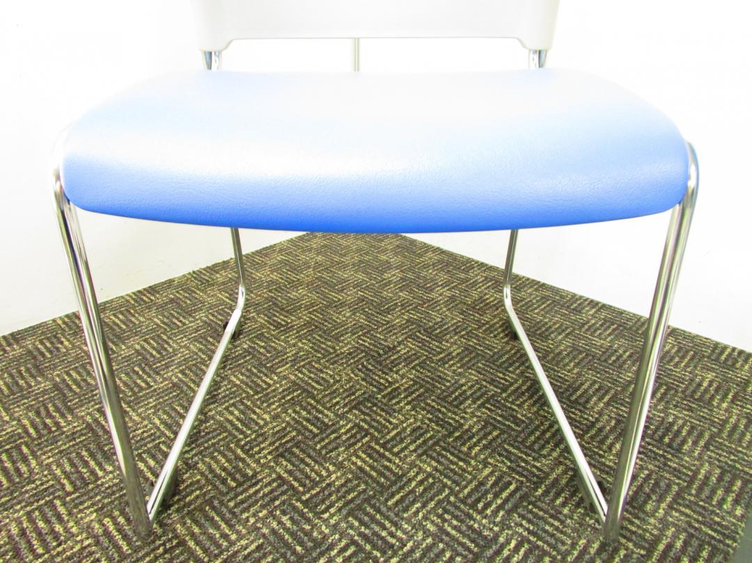 【省スペースで収納できる椅子】スタッキングチェア ミーティングチェア キャスター無し 休憩室 背もたれホワイト 座面ブルー 重ねられる 軽量 状態良好- 埼玉本店