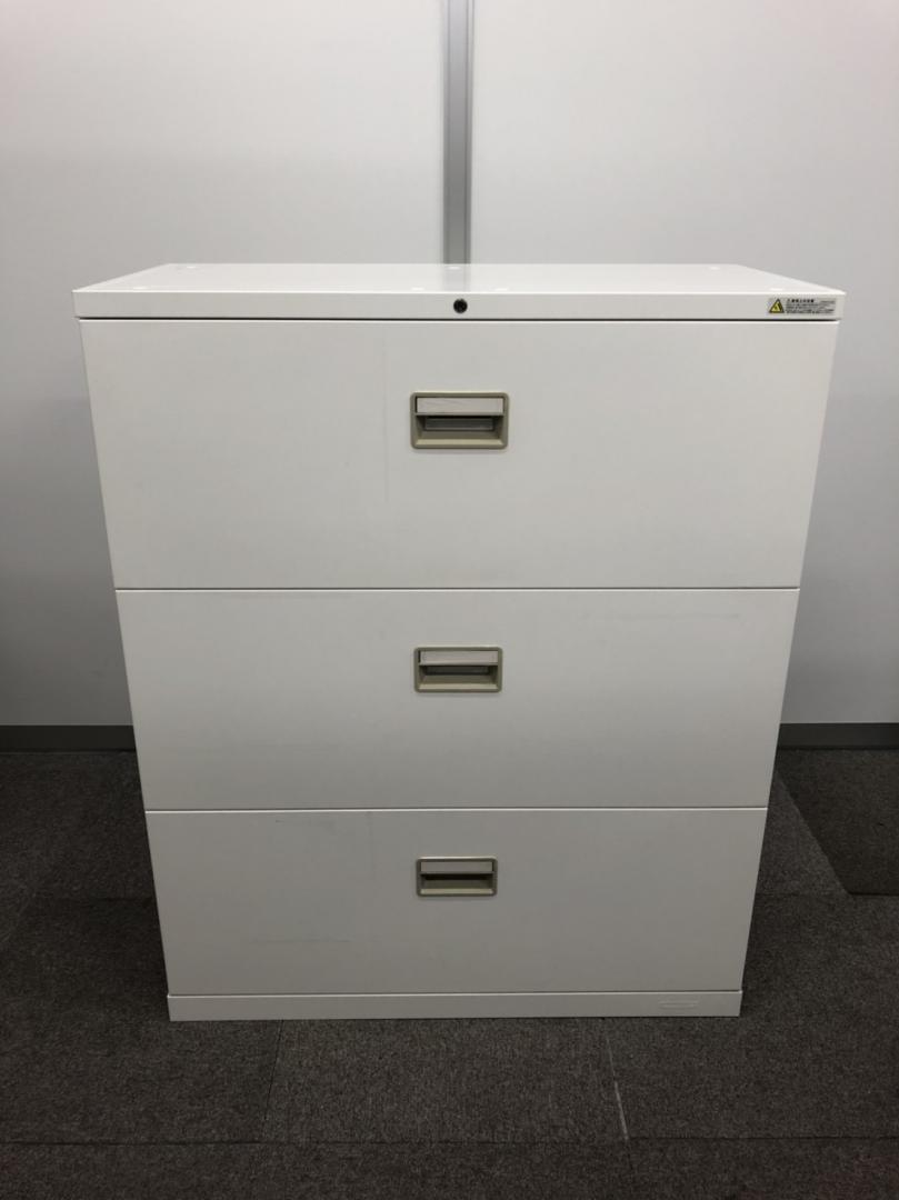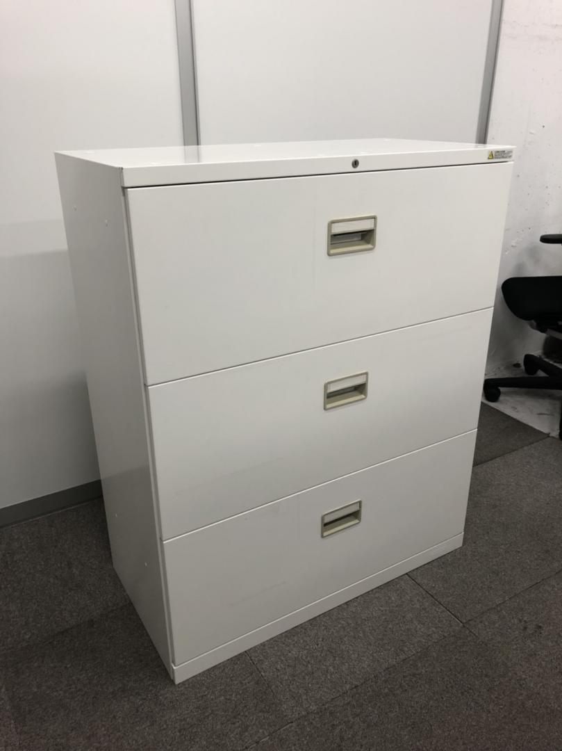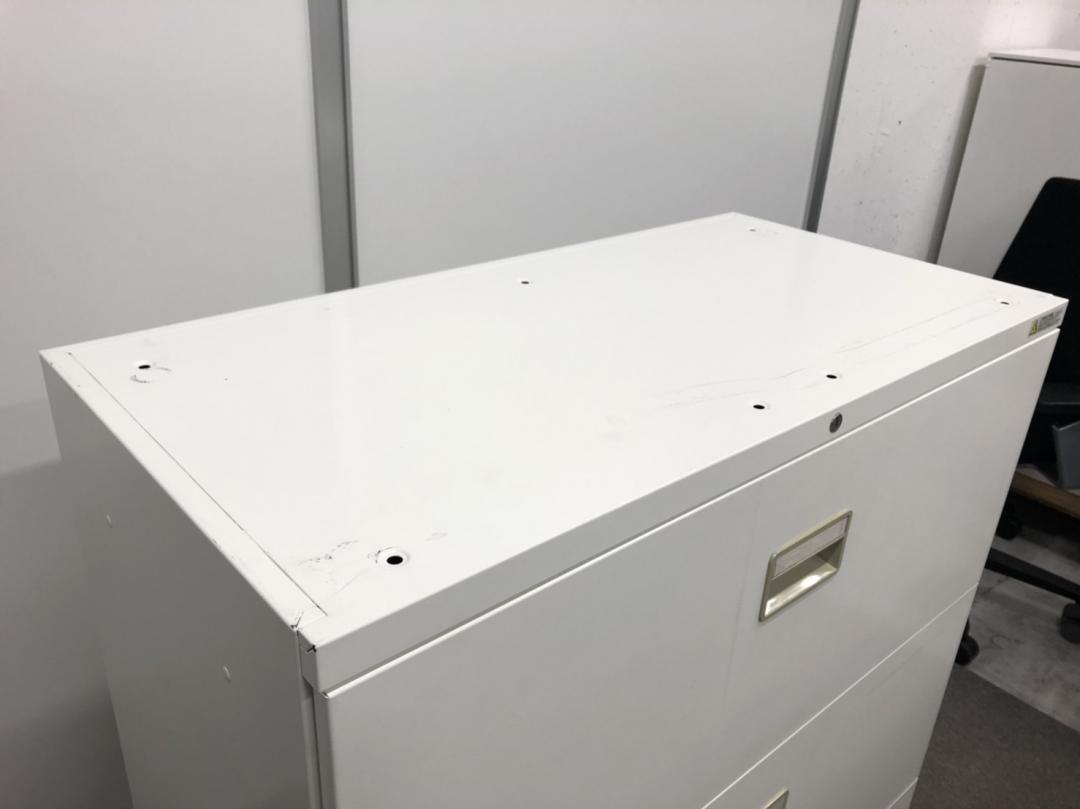オカムラ レクトライン 3段ラテラル書庫 ホワイト天板 シリンダー錠 鍵付き ※取っ手部分に若干日焼けあり