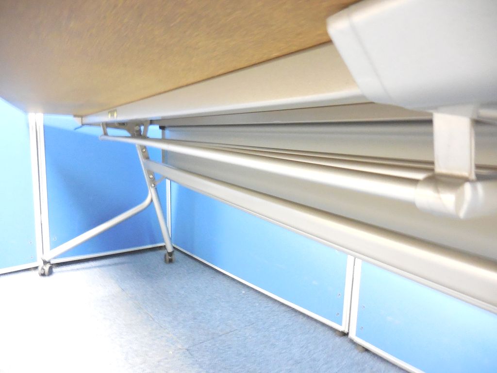 - 一部不具合あり天板歪み、アジャスター無し、キャスター使用不可ようなそのテーブルの本来の効用を果たすための機能以外の一部が使用不可な状態。(例、キャスターロッ ク機能使用不可、棚板無し等がある。)