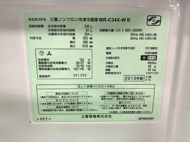 【中古】 MR-C34X-W 冷蔵庫 221115