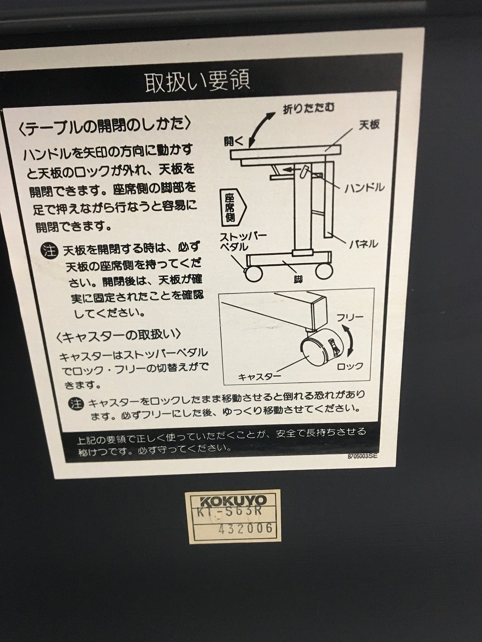 - 一部不具合あり天板歪み、アジャスター無し、キャスター使用不可ようなそのテーブルの本来の効用を果たすための機能以外の一部が使用不可な状態。(例、キャスターロッ ク機能使用不可、棚板無し等がある。)