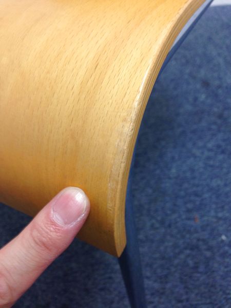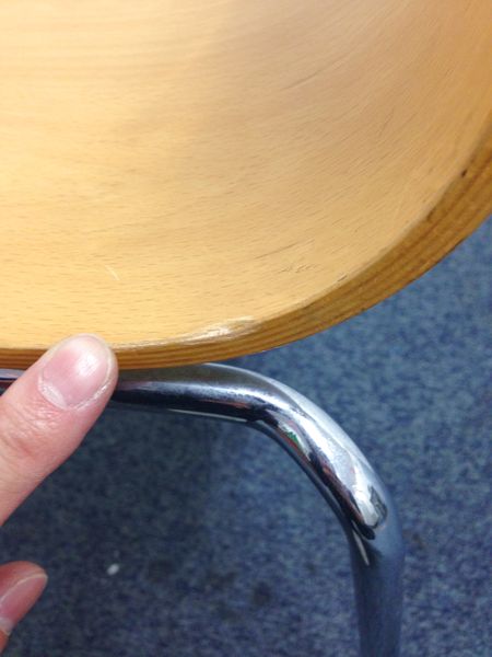 - かなり強い濃い黄ばみ・変色が商品全体にある。(例、座面・背もたれ、脚部等にある。)