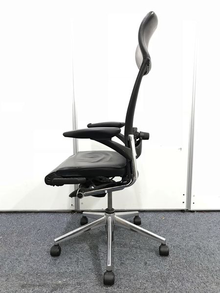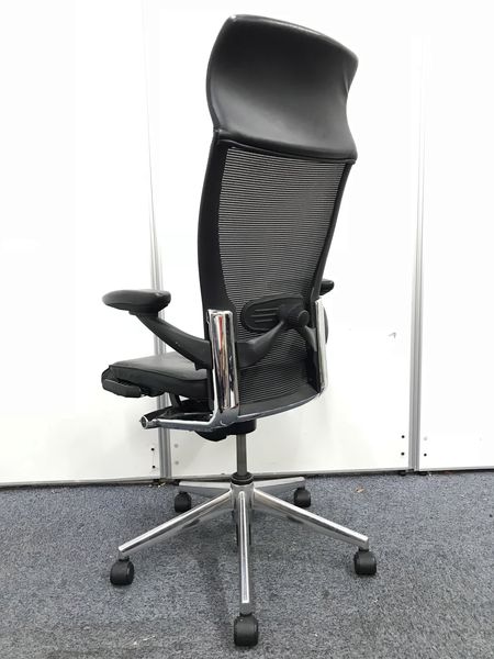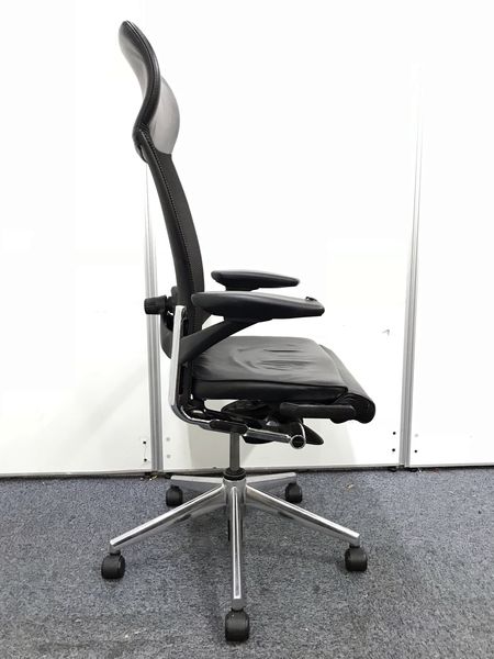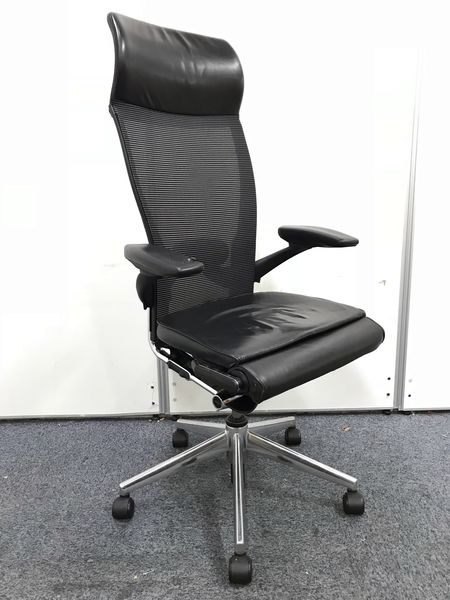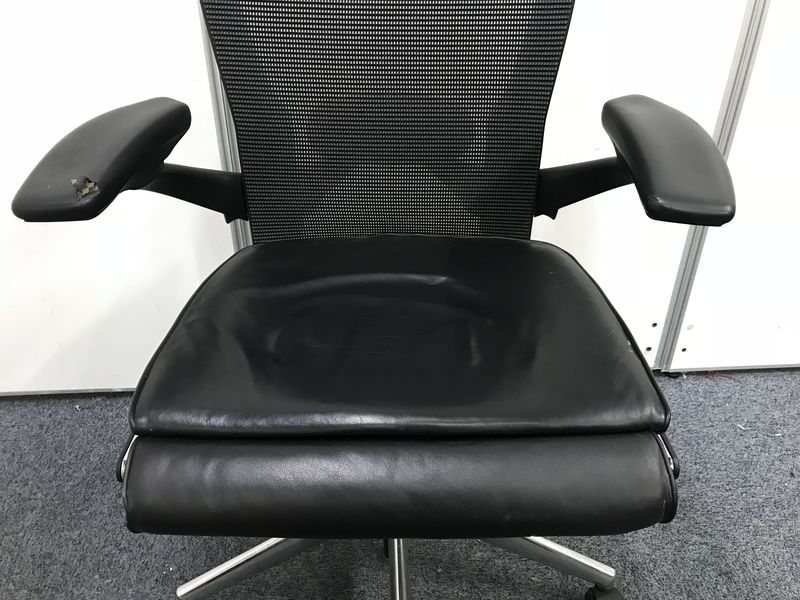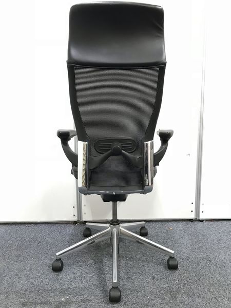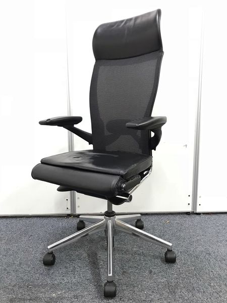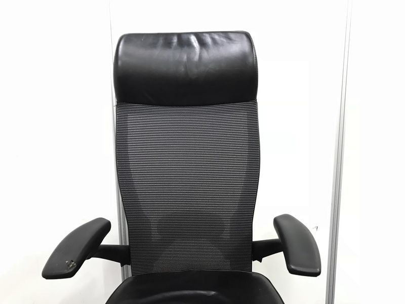 ブラックを基調とし、座面は「革張り」、背面は「メッシュ」と